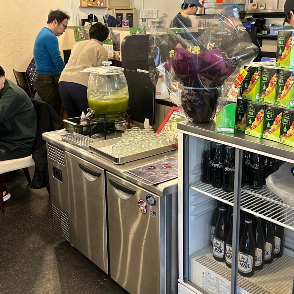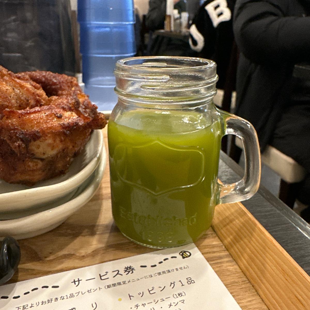 入り口に無料で飲める冷たい草ジュースがあり、ラーメンの脂っこさを和らげてくれて、足りない野菜繊維も補給できると個人的には思いました。