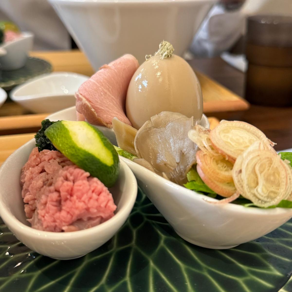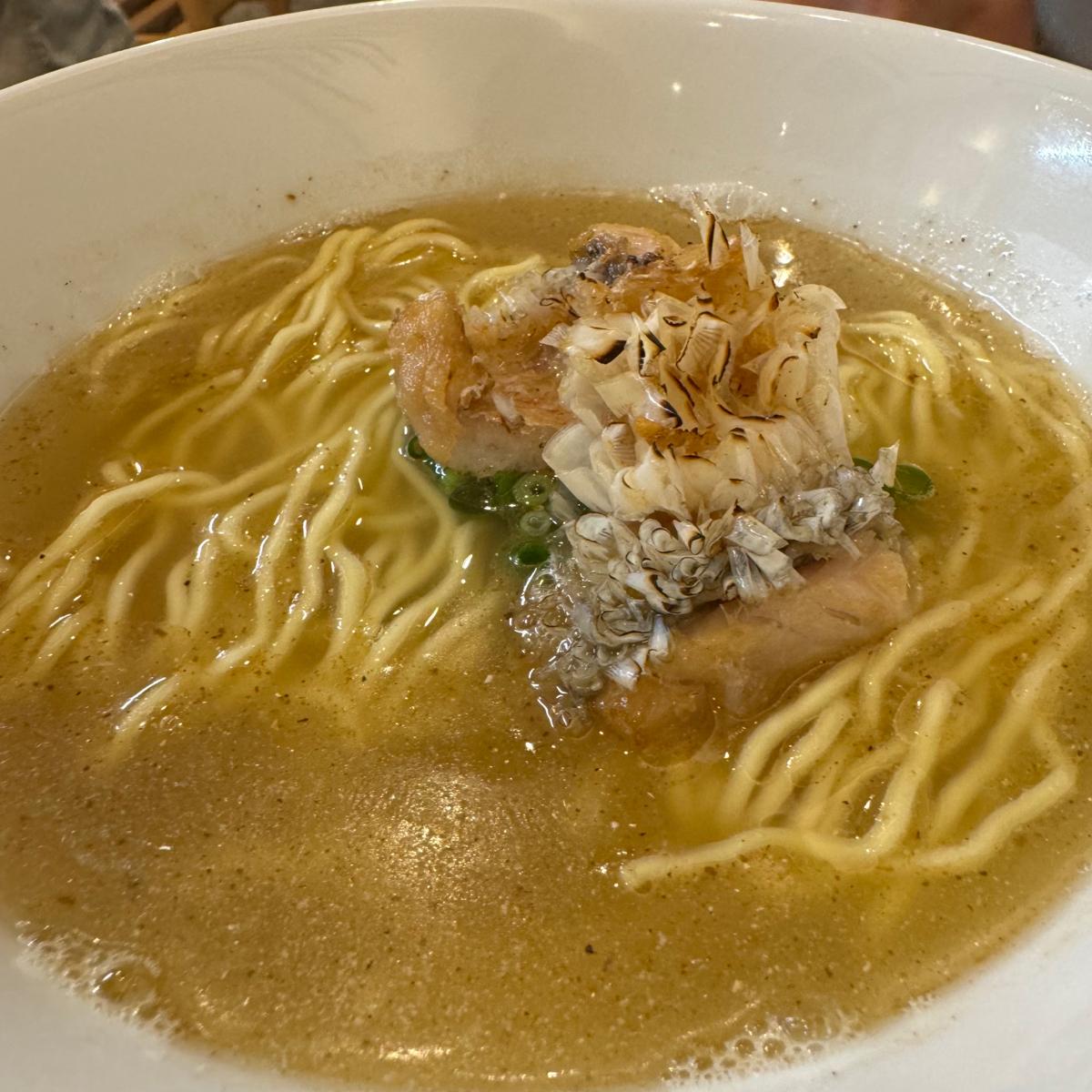 甘鯛の鱗はサクサクで、身は柔らかく優しい味。スープは塩味と魚の出汁が最高。トッピングも豊富でこれ一つで7回以上楽しめる。