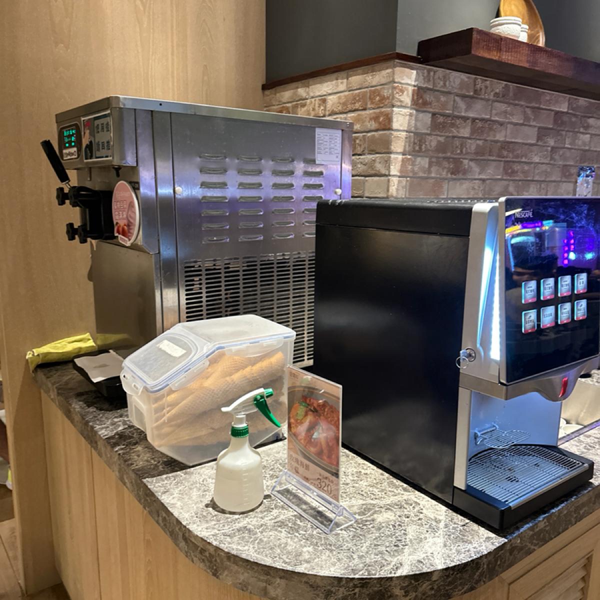 豆腐村 テーブルには海苔と豆腐が置いてあり、おかわり自由です。自分で操作できるコーヒーマシンやアイスクリームマシンもあります。