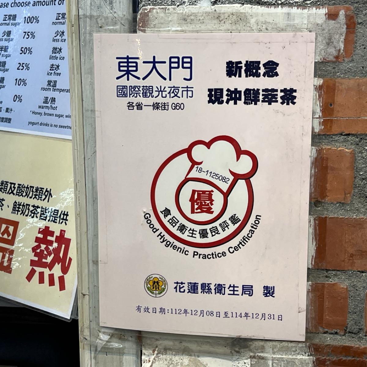 新概念現沖鮮萃茶は花蓮の東大門夜市に位置する、新鮮に淹れたお茶を提供する小さなお店で、健康的で自然な手作り飲料を強調しています。夜市を歩いていると、ちょうどこの店がプロモーションを行っているのを見かけました。中華チームが12強野球大会で優勝したため、すべての商品が20%オフということで、ちょうどいいタイミングだったので、2種類の代表的な飲み物を試してみました:ストロベリーヨーグルトと抹茶ミルクです。