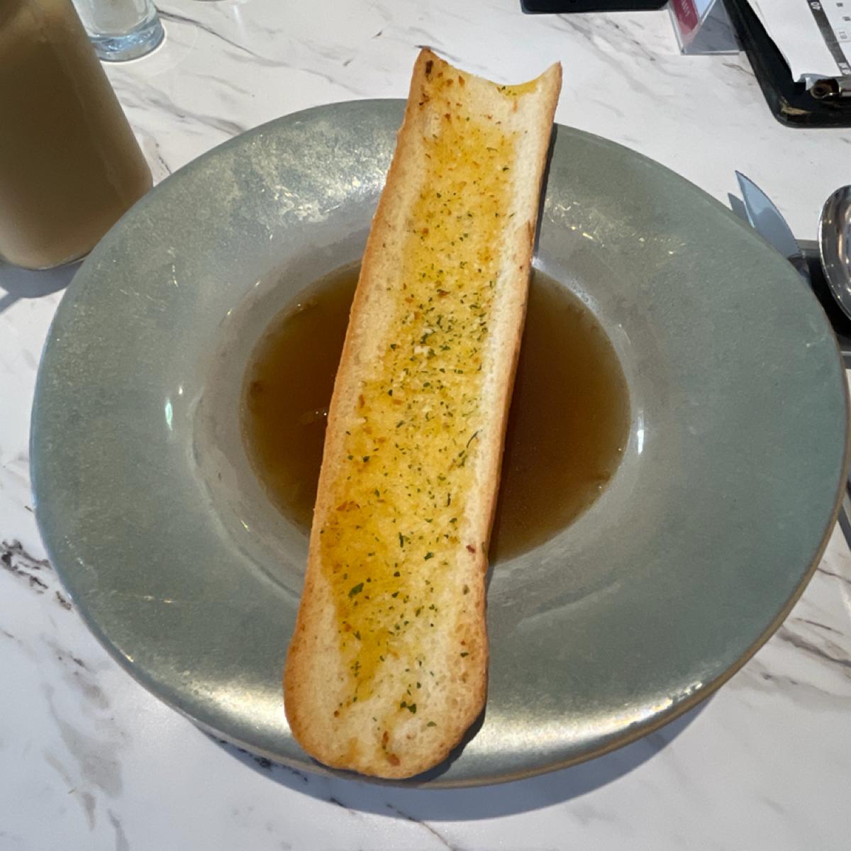 オニオンスープとガーリックパン - オニオンスープはおいしくいただけましたが、ガーリックパンは少し硬くて私はあまり好きではありませんでした。しかし、スープに浸して一緒に食べると、濃厚なスープとの相性が良いと思います。