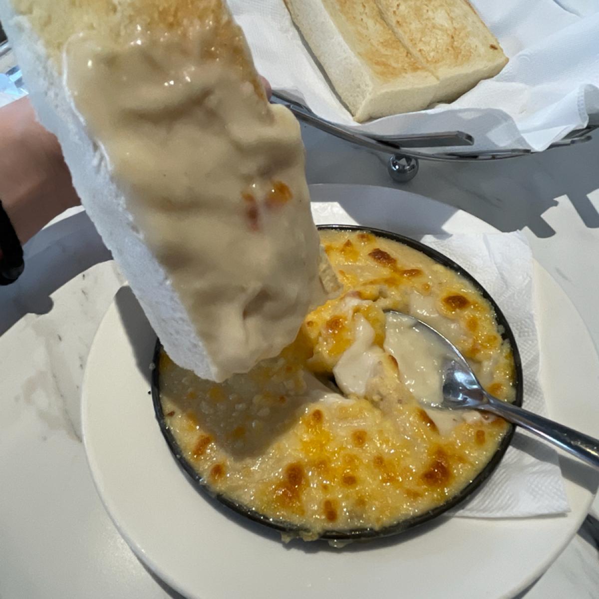 アツアツのマッシュルームペーストをのせた角形パン - 濃厚なホワイトソースのマッシュルームソースがほかほかの角形パンと相性抜群で美味しかったです。好きな方は無料でおかわりできますが、量が多すぎて毎回断念しています。