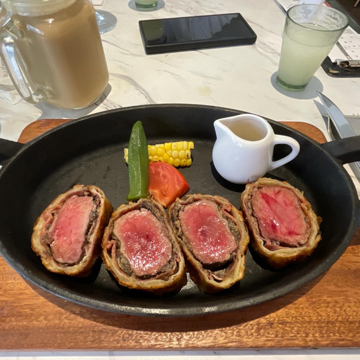 ウィンザー風ステーキ - 牛肉にトリュフマッシュルームソースが添えられていて、外はパイ生地に包まれています。肉はフランクよりも柔らかく感じましたが、少し塩気が強かったです。
