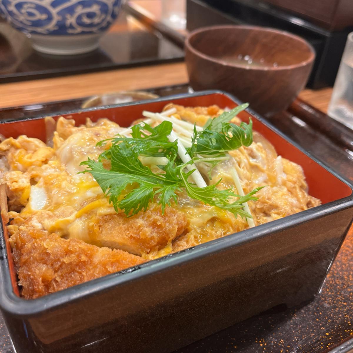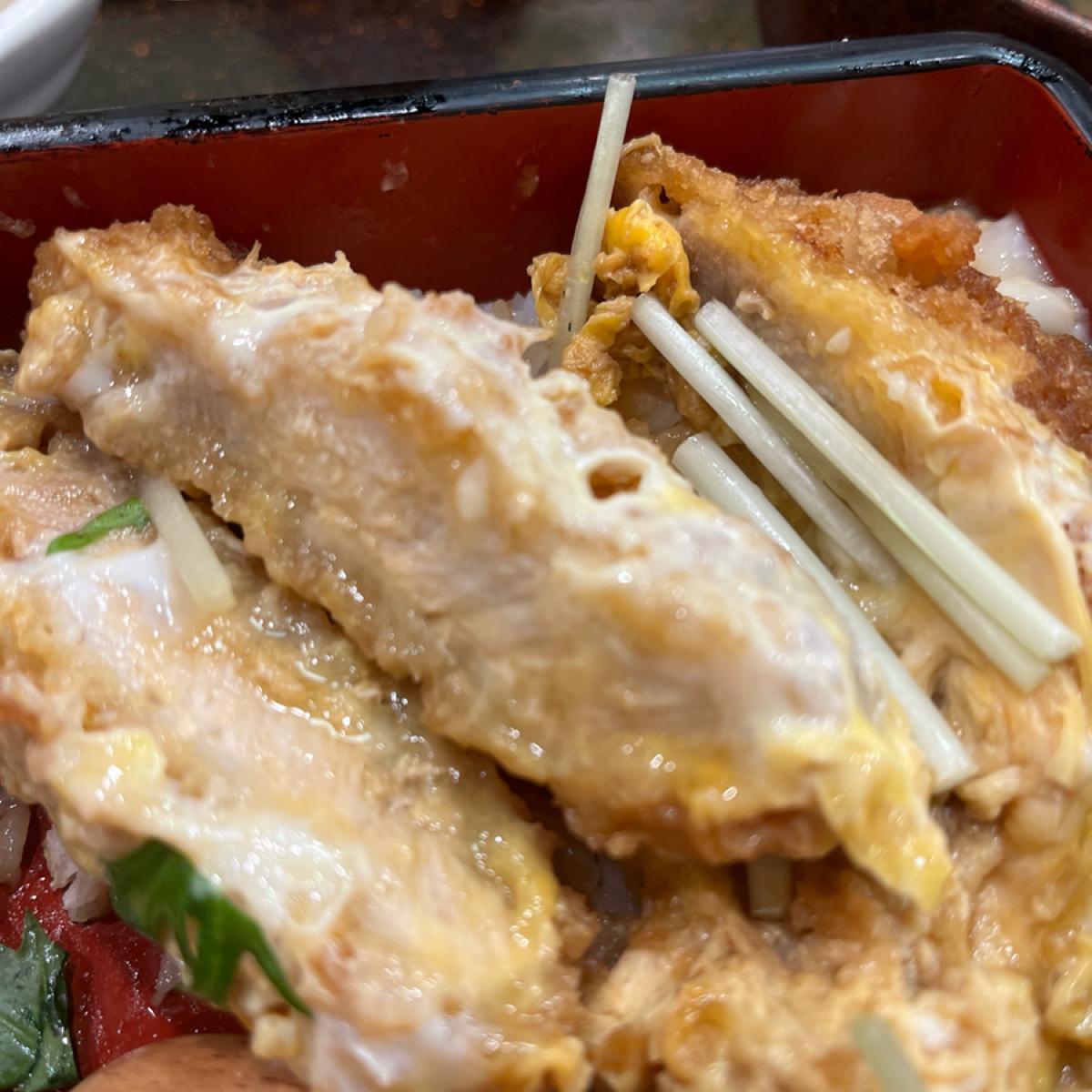 今回はカツ丼、あさりうどん、ミニ山菜蒸しを1人前で注文しました。揚げたカツはある程度の厚みがあり、外はカリッと中はふんわりと、少し半熟の卵液につけて一口コシヒカリと合わせると美味しいです。ソースが少し塩辛いのが残念。