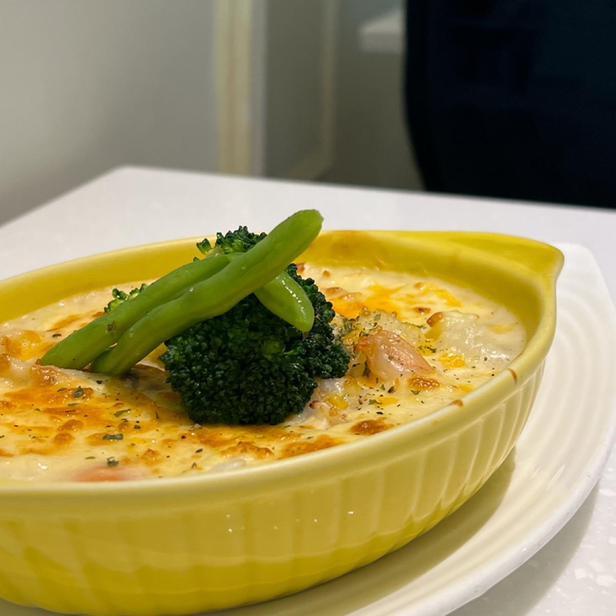 中にはエビ🦐、イカ、カニカマなど多くの海鮮が入っています。グラタンとホワイトソースのおかげで、一口ごとに非常に濃厚ですが、海鮮の質には少し失望しました~
