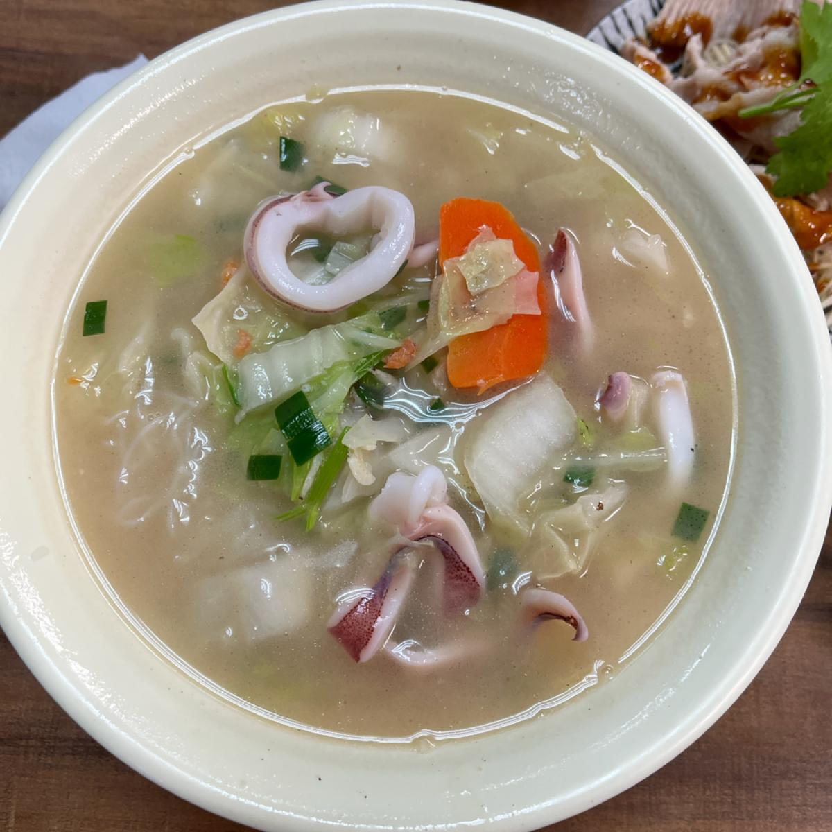 今日は中巻きビーフンを注文しました。 キャベツと野菜がたっぷり入った新鮮な魚介風味のスープです。 ビーフンと合わせてスープが染み込んでいて、しっとりとした食感です。