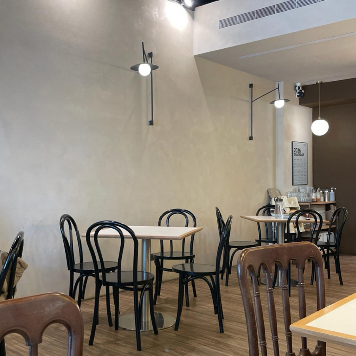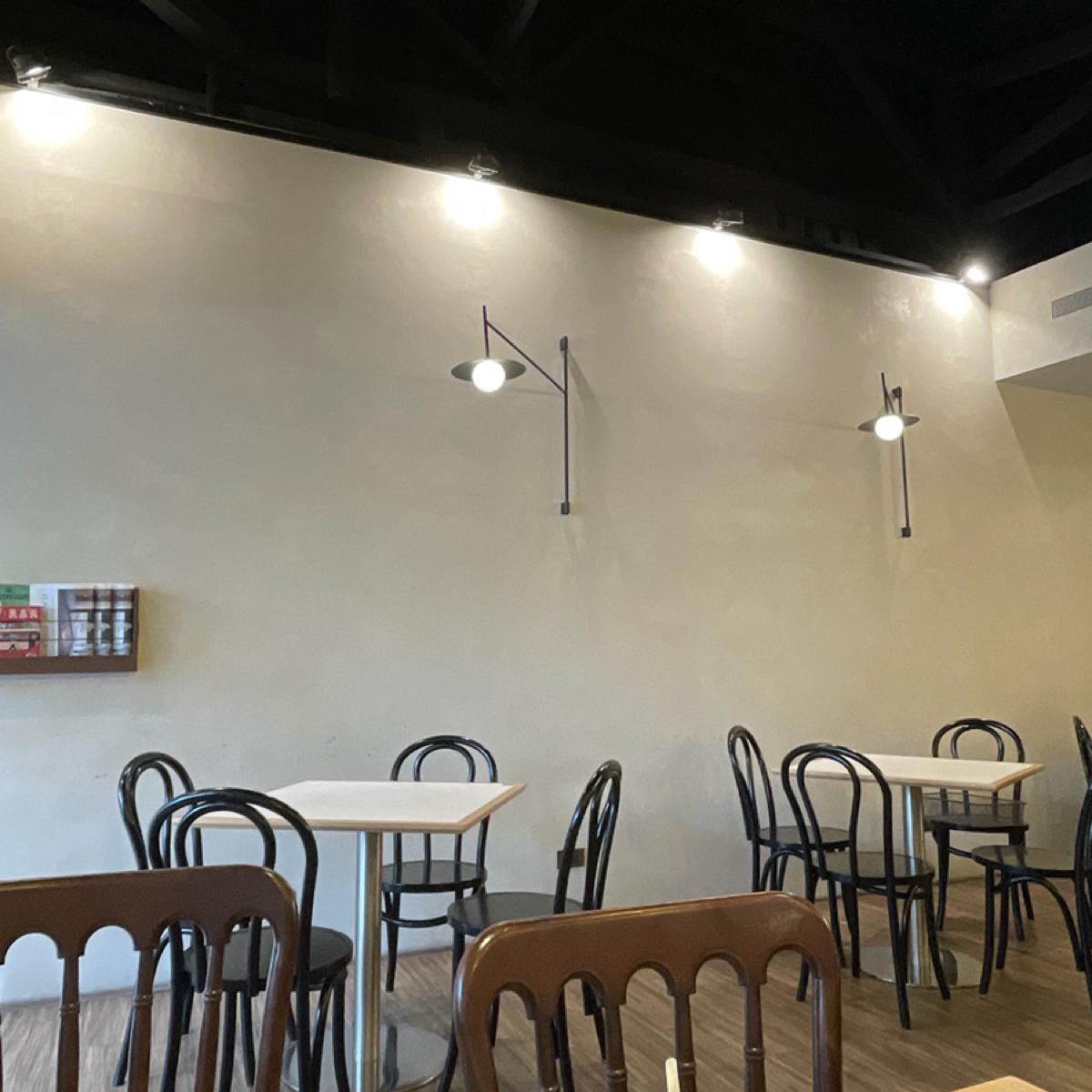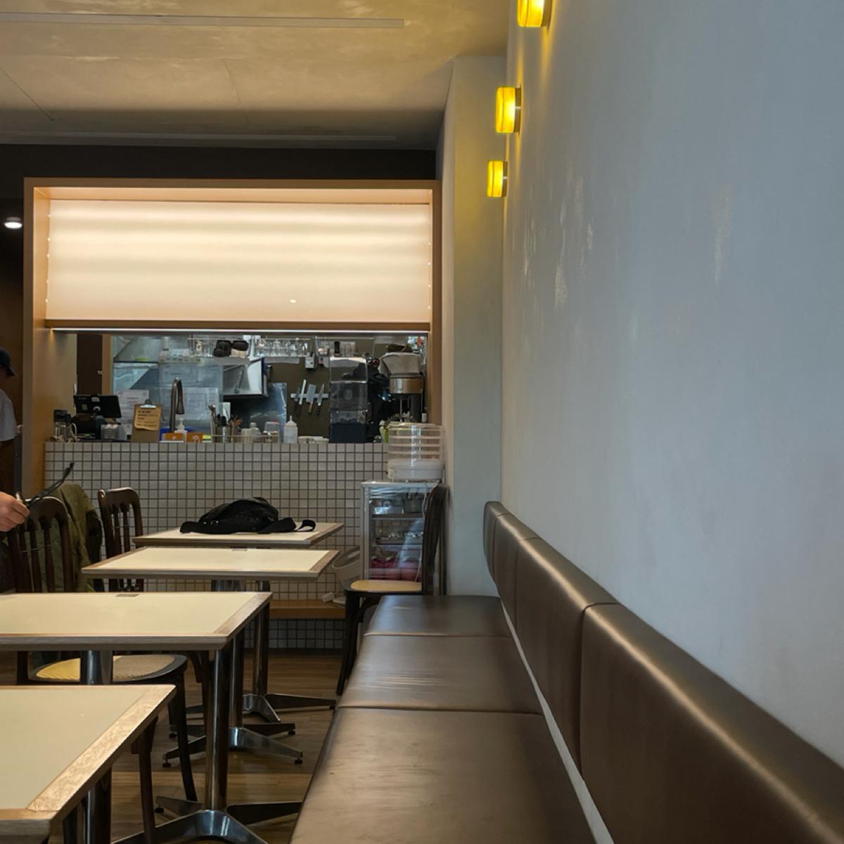 店の形はかなり特別で、V字型になっています。店内の空間はシンプルで清潔感があり、可愛い装飾がされています。座席は特に多くはありませんが、平日の午後は人が少なく、待たずに入れます。各自、最低一品を注文する必要があります。