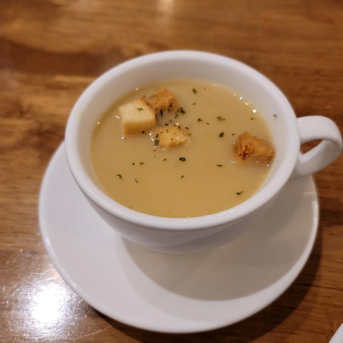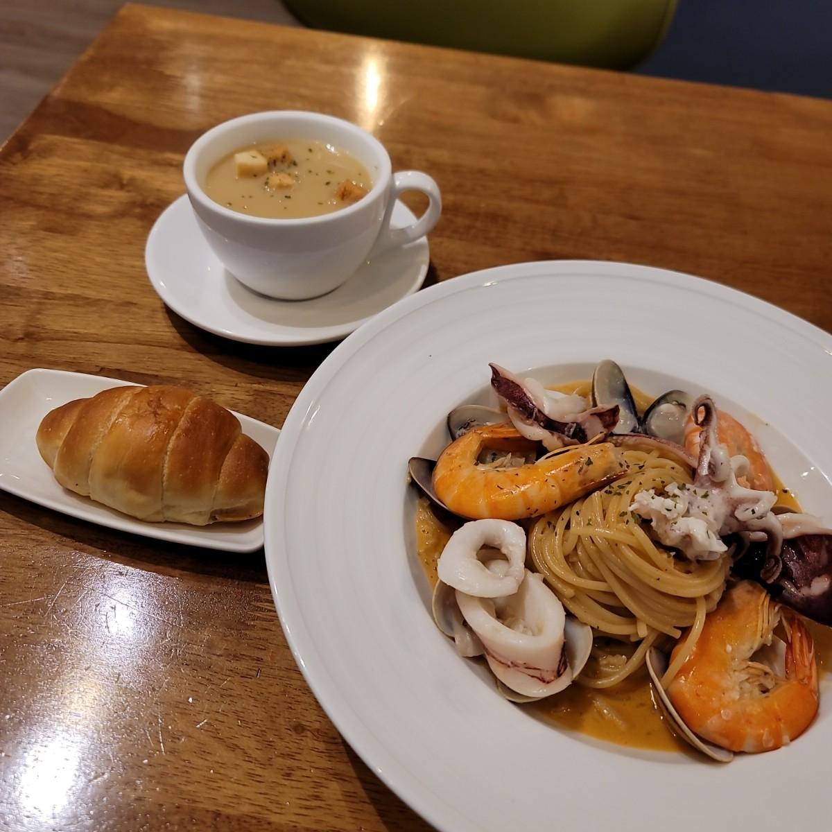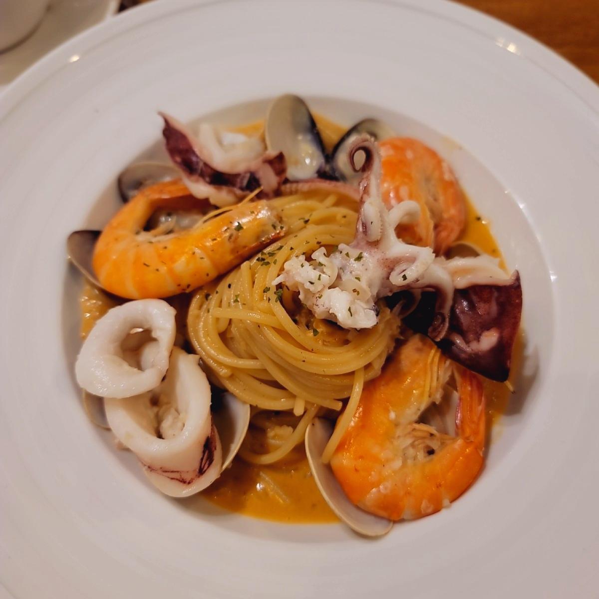 食事はスープ、ドリンク、パン、デザートが付いた定食を追加すると良いと思います。かなり濃厚で美味しいです。今日のメインは、シーフードパスタのホワイトソース添えでした。 小さなチューブとエビが3匹、そしてかなり大きなアサリが5つ付いていました。 シーフードは全体的にとても美味しく、ソースもとても濃厚でした。しばらくの間、Qボムはあまり新鮮ではないようでした。