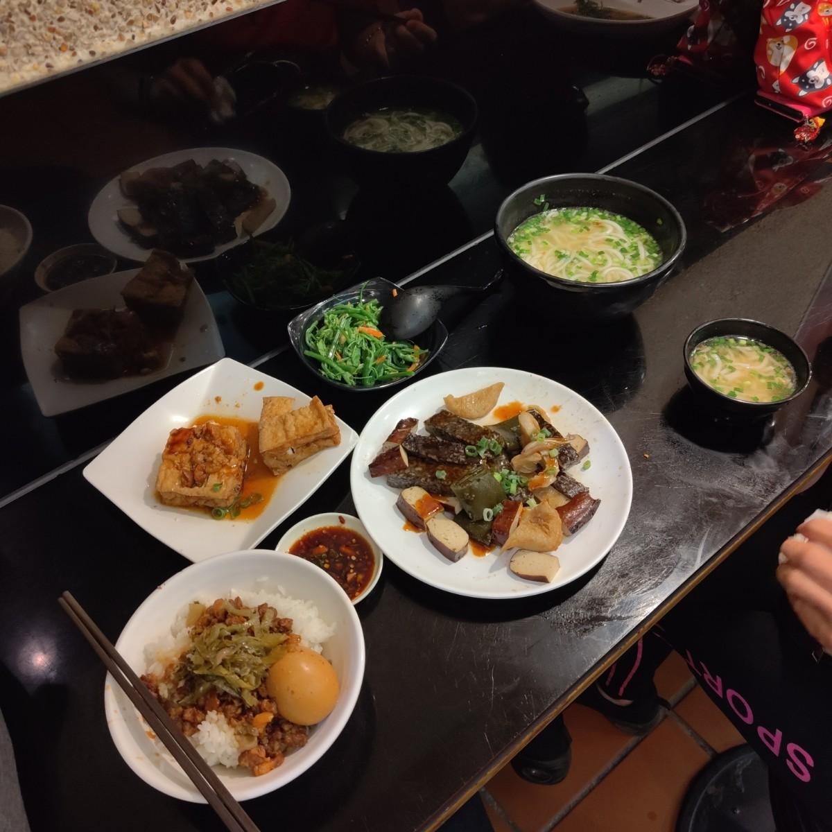 客家麺館という名前ですが、実は客家要素はそこまで明確ではありません。主食は牛肉、鴨肉、きのこ細切り豚、陽春豚細麺に分かれており、白麺、細麺、浸ご飯、ニョッキから選ぶことができますが、代表的なものは「もちむすび」と「麺団子」です。本当はニョッキが食べたいのですが、もちむすびのほうが好きなので、もちむすびにおかずとスープを加えて、お腹いっぱいになりました。