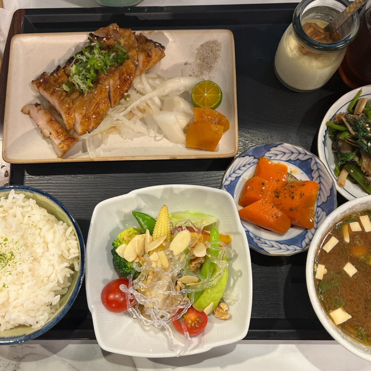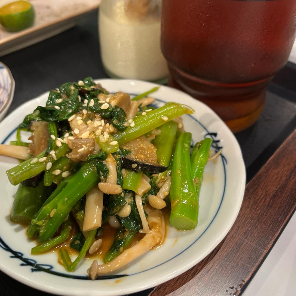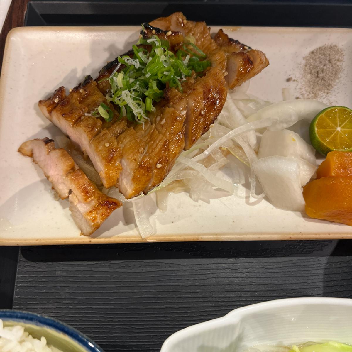 関西風ピリ辛松阪豚(定食) メインの松阪豚は程よく焼き上げられており、臭みがなくジューシーで肉本来の旨みが感じられる絶品のメイン料理です。肴も一つ一つ丁寧に作られていて手抜きはありません。特筆すべきはケールの茎を加工したもので、ソースに味噌が絡んでいて香りがとても強いおかずです。