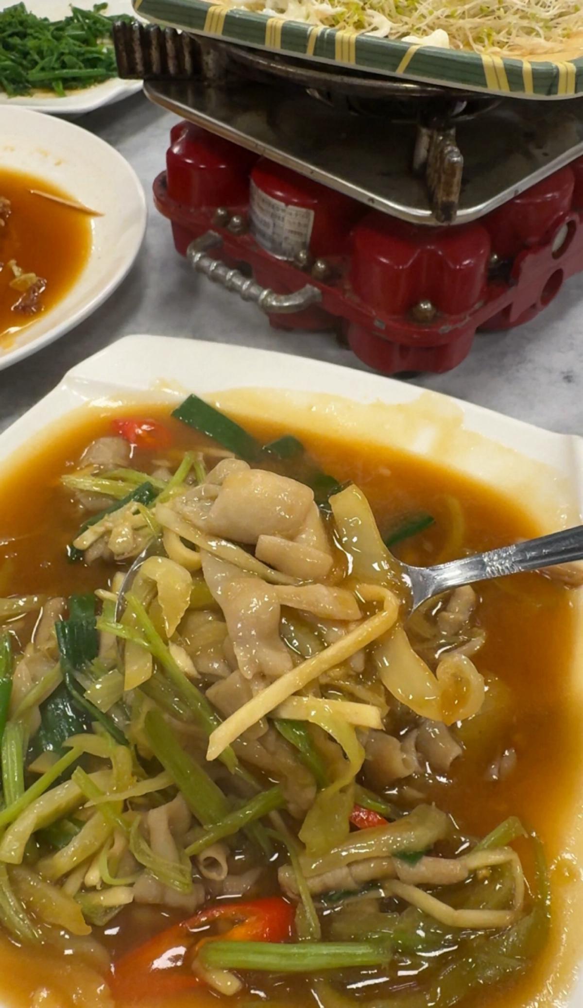 三杯中巻きは新鮮で弾力があり、炒めた貝肉は少しの量ですが、味はとても良いです;旬の野菜と牛肉の炒め物は、牛肉の塊も大きく、ちょうど良い八分通りの焼き具合で、ご飯と特に相性が良いです。生姜と豚の腸の炒め物は酸味がたっぷりで食欲をそそり、剥き唐辛子の鶏スープは濃厚なスープで、スープのおかわりも元のスープでとても誠意があります。ただ、鶏皮には時々鶏毛が少し付いているのが残念です。