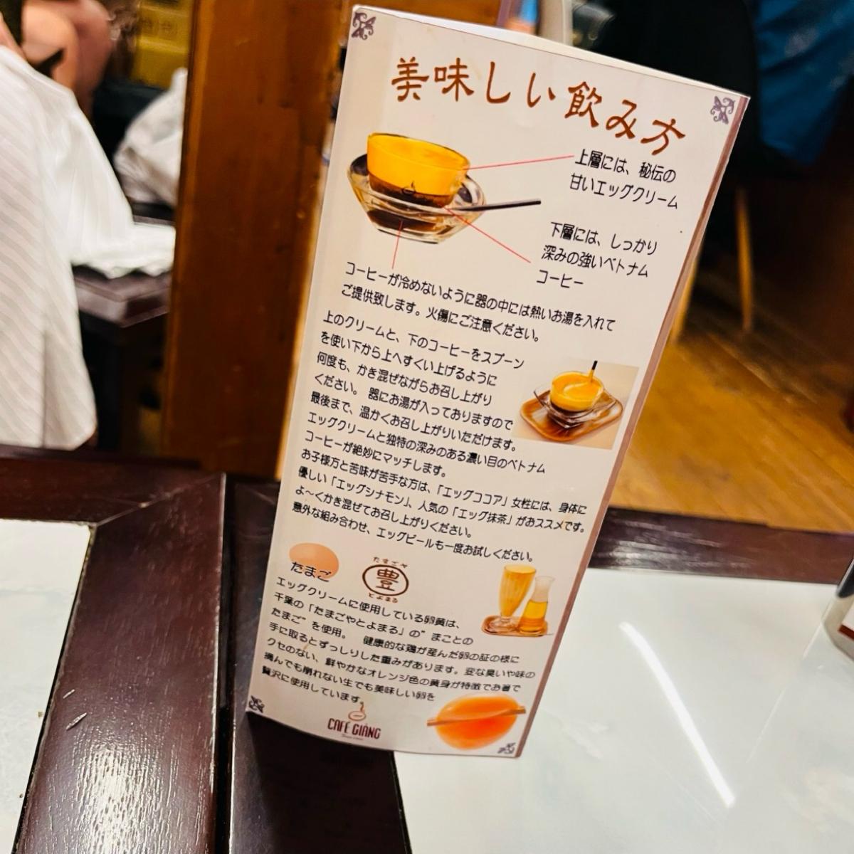 日本では、『CAFE GIANG』さんならではの、ベトナムから直輸入した独自の焙煎豆のベトナムコーヒー【エッグコーヒー】をはじめ、【エッグ抹茶】【】エッグビール】などバラエティに富むドリンクメニューがありました。