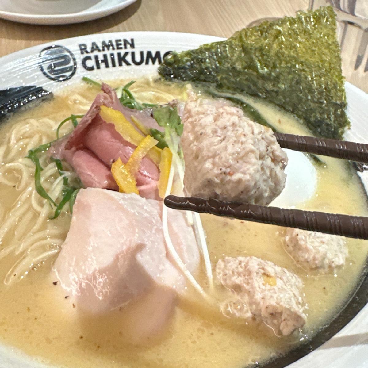 私が頼んだのは看板ラーメンの全部盛りで、豚チャーシュー2枚、鶏チャーシュー3枚、鶏肉団子3つ、温泉卵1つ、そして海苔1枚が含まれています。