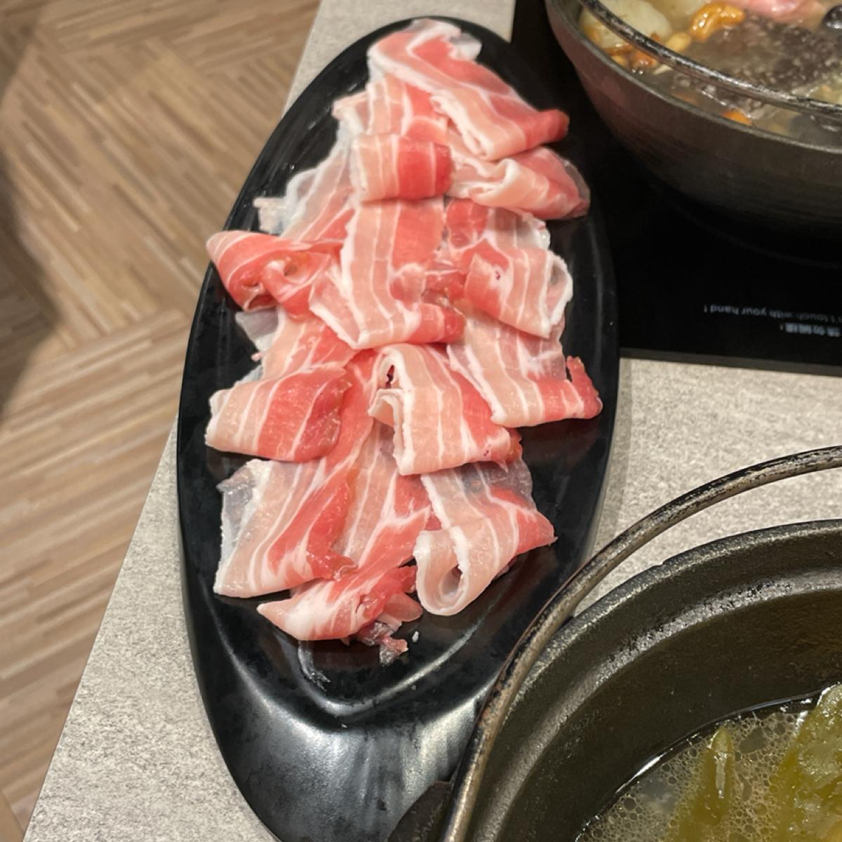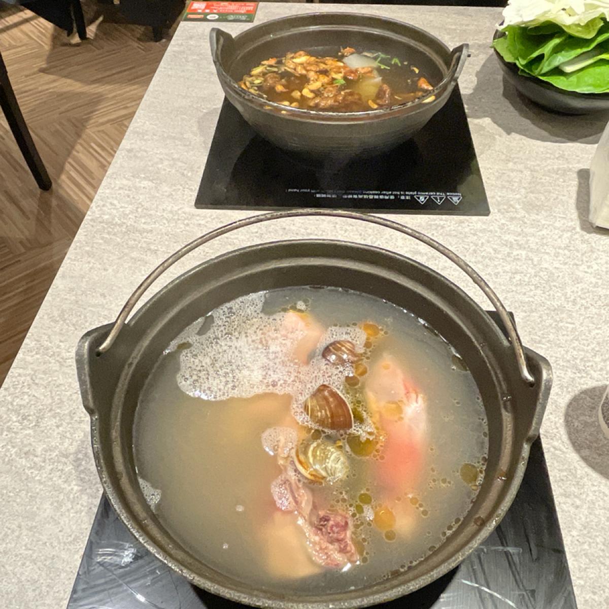 約10分待った後、スタッフが先に入ってもいいが、料理が来るのに時間がかかる可能性があると言いました。もしそれが受け入れられるなら、先に席に着いていいとのこと。入座後、QRコードを使って注文しました。私は剥皮辣椒ハマグリ鶏鍋と板腱牛を頼みましたが、出てくるまでちょっと時間がかかりました。剥皮辣椒鶏スープのごま油の味がかなり感じられ、飲んでみると悪くない味でした。中にはいくつかのハマグリと骨を切った鶏もも肉が三つ入っていて、煮ている間に鶏肉を刺してみてもまだ血水が出てきました。その後、実際にかなりの時間が経過してしまったので、スタッフにそれが普通かどうかを尋ねたところ、スタッフが料理をキッチンに戻して煮てもらったら、比較的早く食べられるようになりました。友人は彼らの名物の功夫排骨酥鍋とベーコン豚を注文しましたが、スープはかなり香ばしかったものの、少し油っぽい感じがしました。肉の量は十分だと感じ、私が思っていたよりも多めでした。さらに、パイナップルシュリンプボールも注文しましたが、まあまあでした。