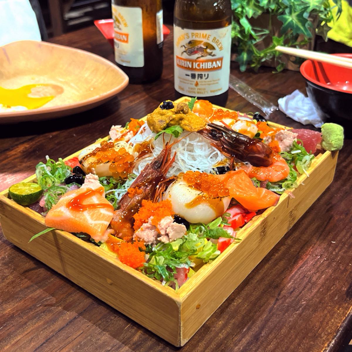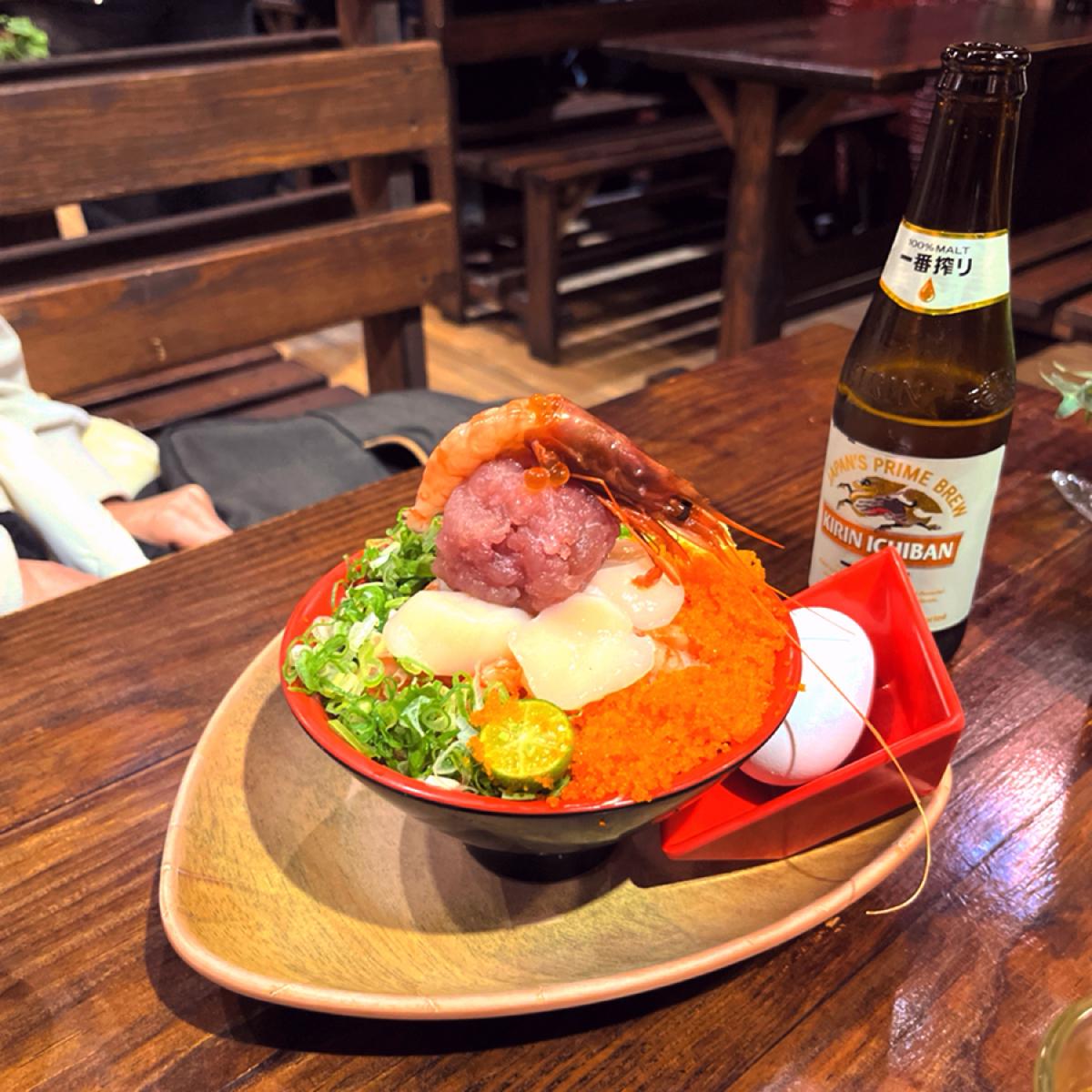 Googleで有名な刺身丼専門店です。今回は3人での食事でしたが、金曜日の夜で満席でした。 8時に1時間待つかもしれないと言われ、登録を探していると座れるとの連絡がありました。待ち時間は15分ほどでしたが、それほど苦ではありませんでした。
