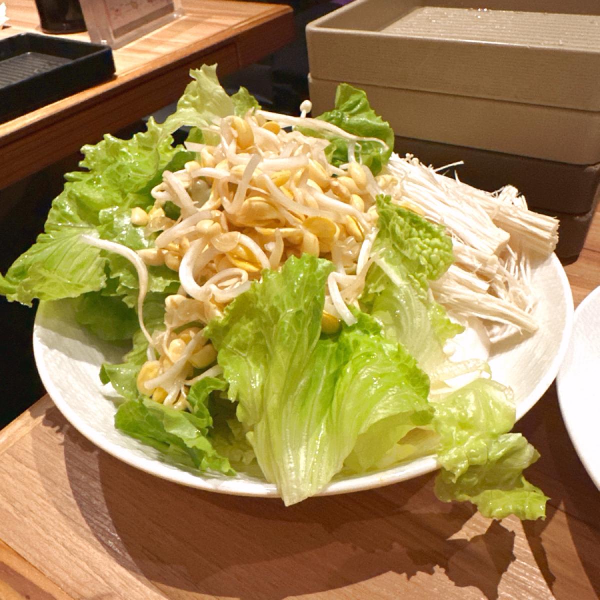 このお店は席が狭くて混んでいて、2人座ると肉皿+野菜皿を置くスペースがありません。