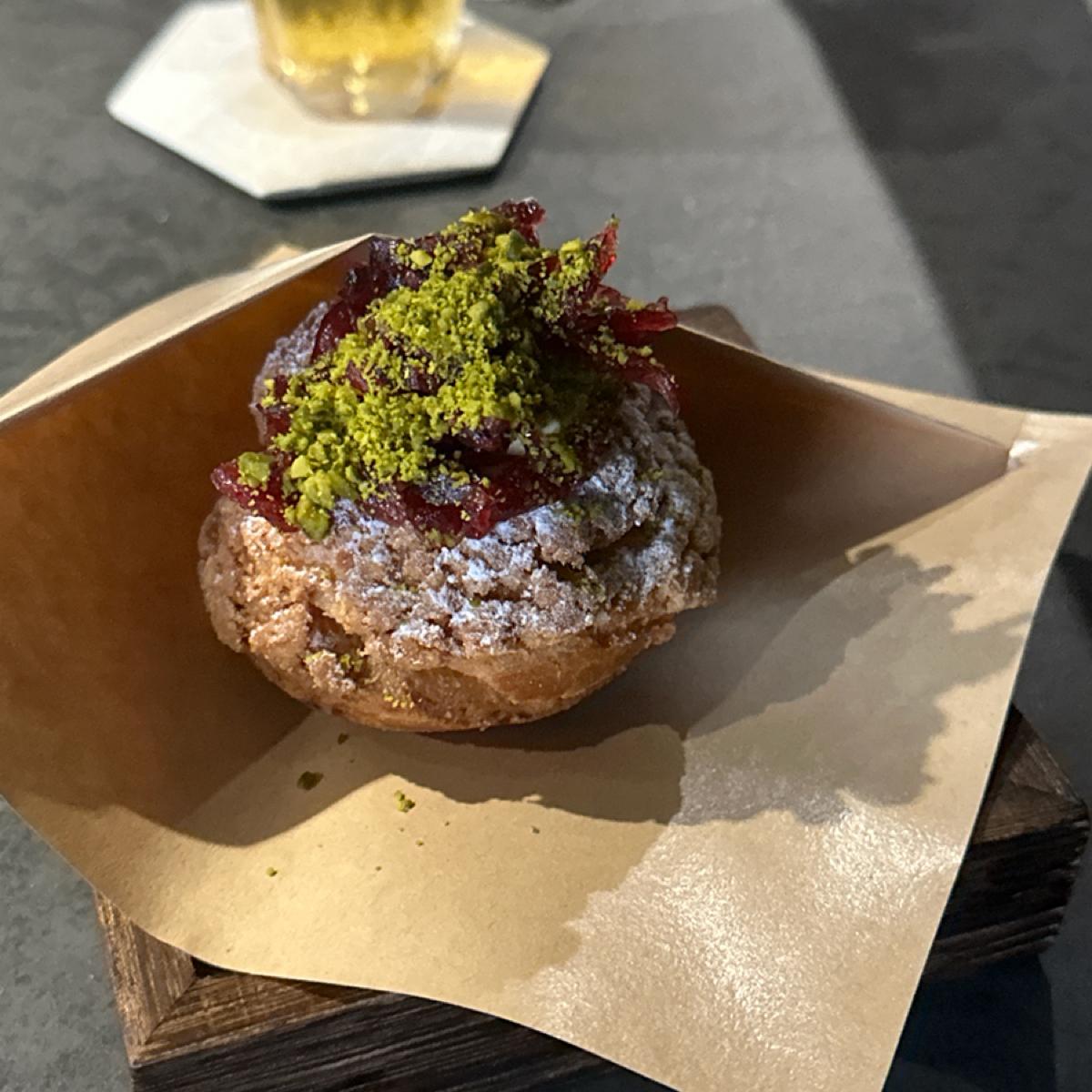 見た目は緑色のドーナツに見えますが、白エビ、レモンの葉、白黒豚肉、外皮で包んだタイ産緑茶、そしてシラチャーマヨネーズを組み合わせたアイシングが施されたドーナツです。えびせんべいとは違う、新鮮でザクザクとした食感がとても素晴らしいです。