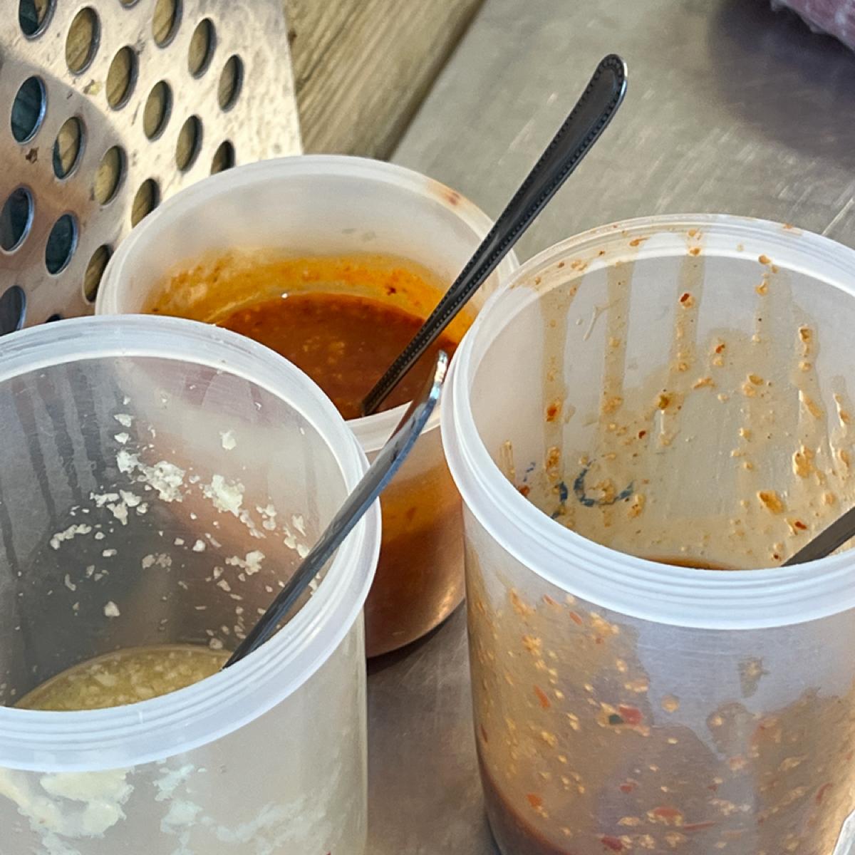 それぞれ刻みニンニク、豆板醤、胡椒、ネギペーストが入っています。