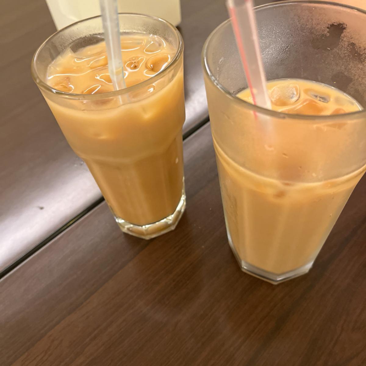 〉 ミルクの風味があまり目立たないアイスミルクティー 写真は中カップと大カップのサイズです 大カップは$25、中カップは$20です。