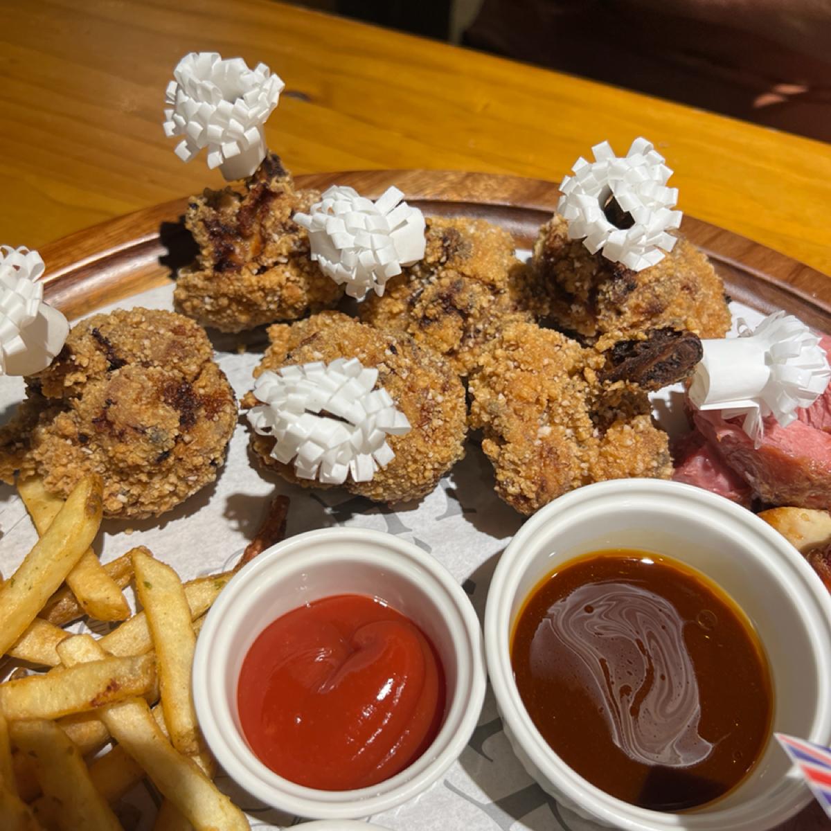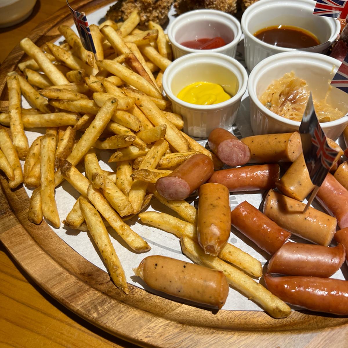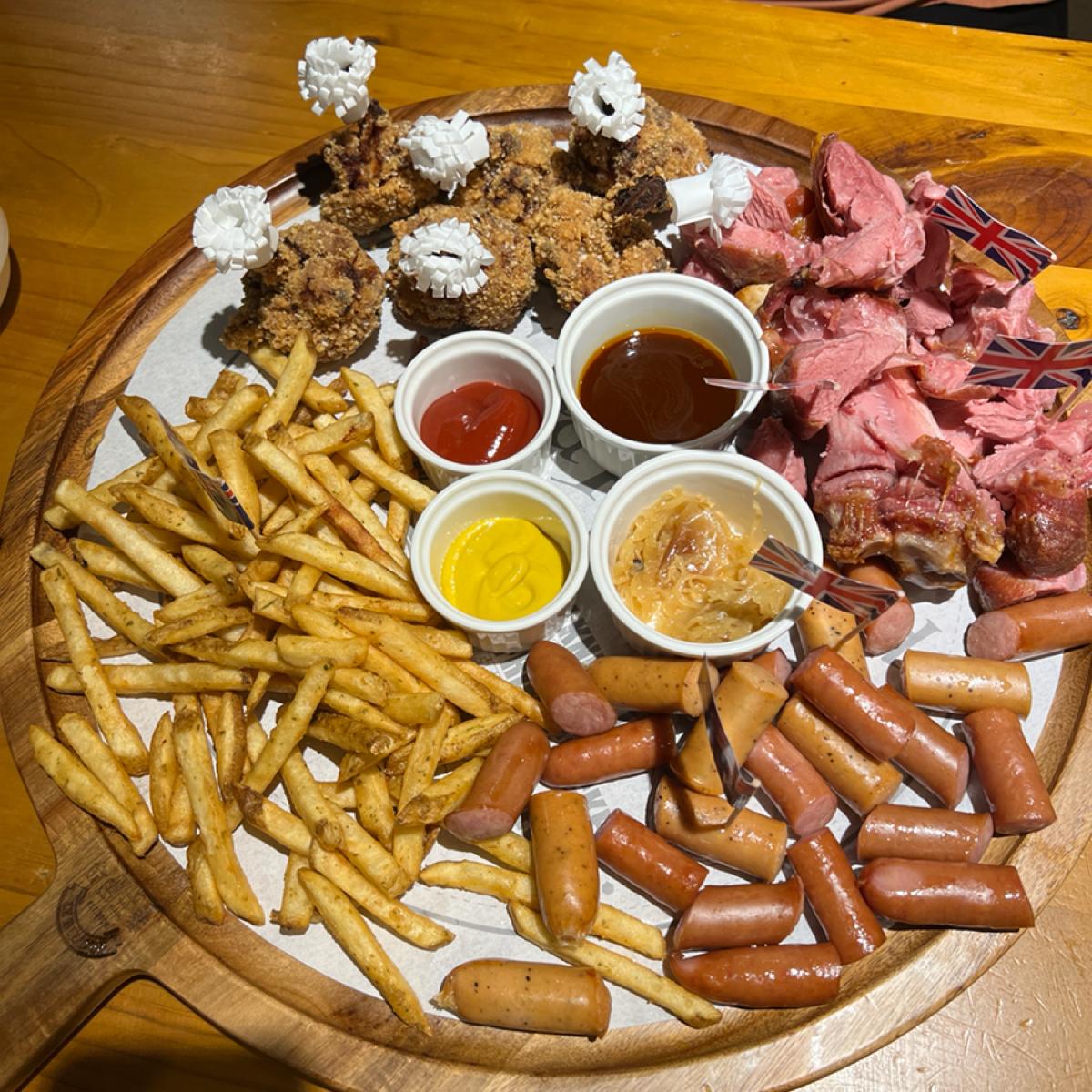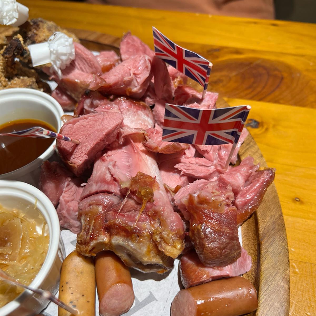 特に印象に残ったのは大盛りプレートに入っていた椒麻鶏で、相変わらず美味しく、少し油っぽいですが許容範囲でした。ドイツの豚足は見た目が硬そうでしたが、実際は柔らかく、皮はとてもパリッとしていました。ソーセージには三種類の味(青花椒、黒胡椒、スモーク)がありましたが、少し塩気が強めでした。