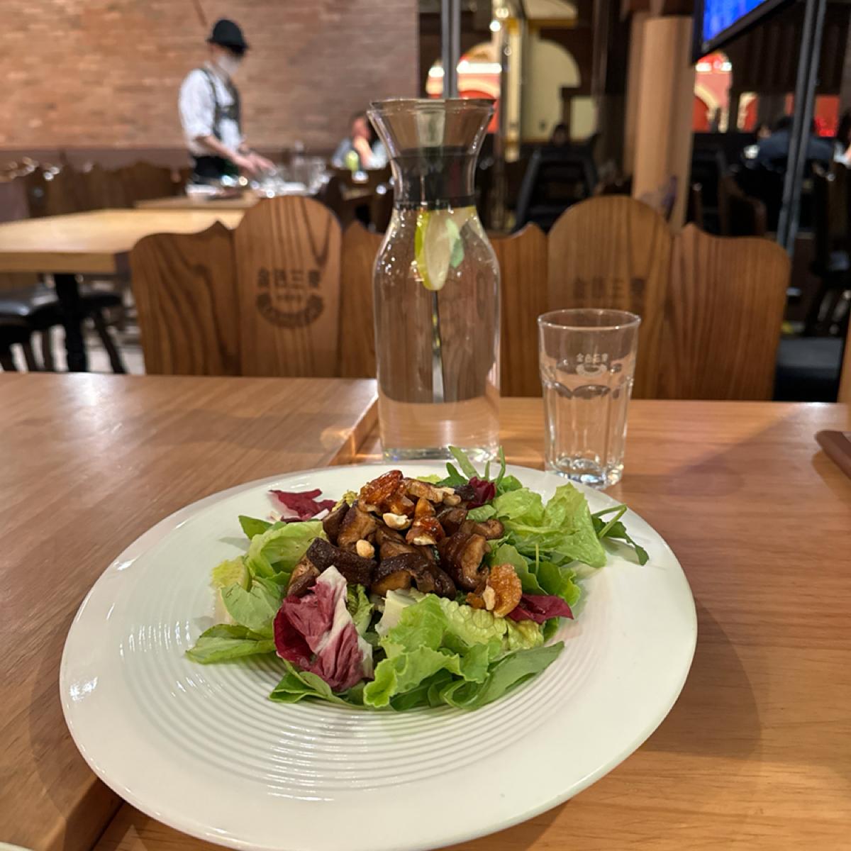 -炭酸水-60-は炭酸水製造機で作りましたが、泡持ちが悪く、レモンのスライスを加えます。 -握手シャオノンウェンサラダ-ベジタリアン-250-一般的なレタスに加えて、ゴマの葉もたくさん入っているので、苦味があります。上に乗っているナッツは果糖がたっぷり入っていて、ザクザクとした食感が楽しめます。赤ワインビネガーは酸味が強くて味が濃いです。上には調理したキノコと揚げた黒胡椒が乗っています。