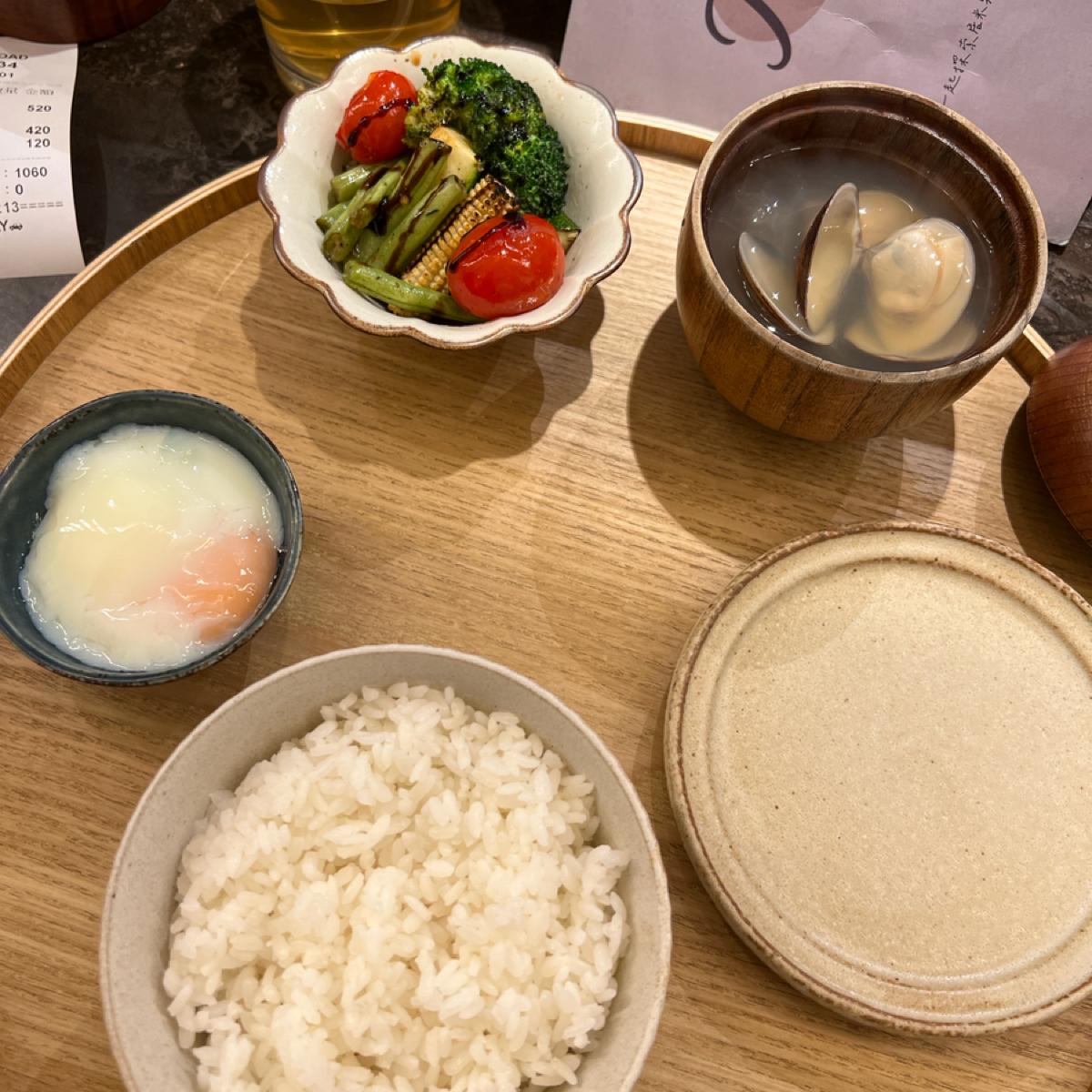 スープ、白ご飯、焼き野菜、温泉卵、ハンバーグ2つ
