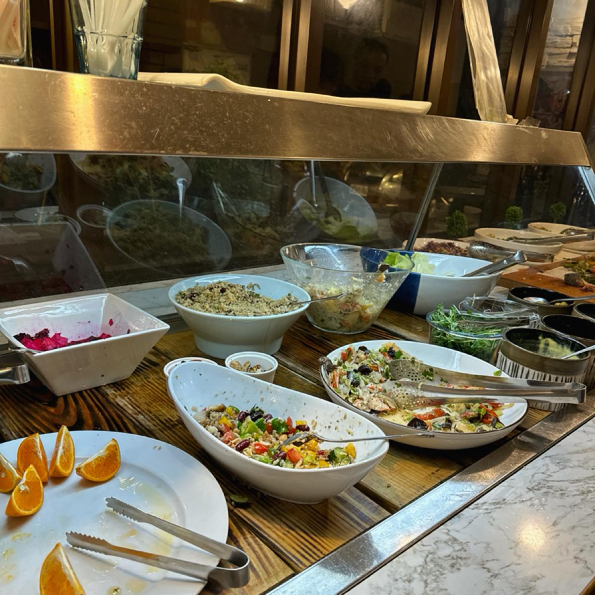 見た目も爽やかな地中海サラダのセルフサービス専門店で、セルフサービスのバーにはスープやドリンクなども付いており、何も注文せずにそのまま楽しむ人も多いです。