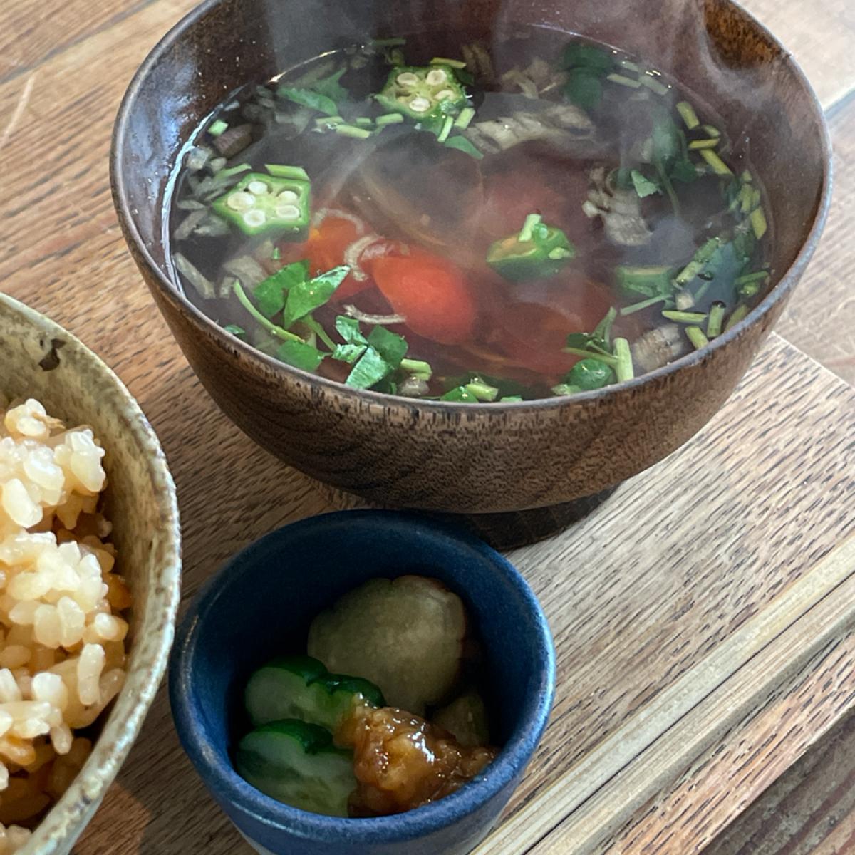 一小塊鯛魚肉下面是炊飯。炊飯真的非常有味道,香氣十足!湯是秋葵蔬菜湯,一點點醬瓜漬物,搭配這樣吃喝著熱湯很暖心🥰