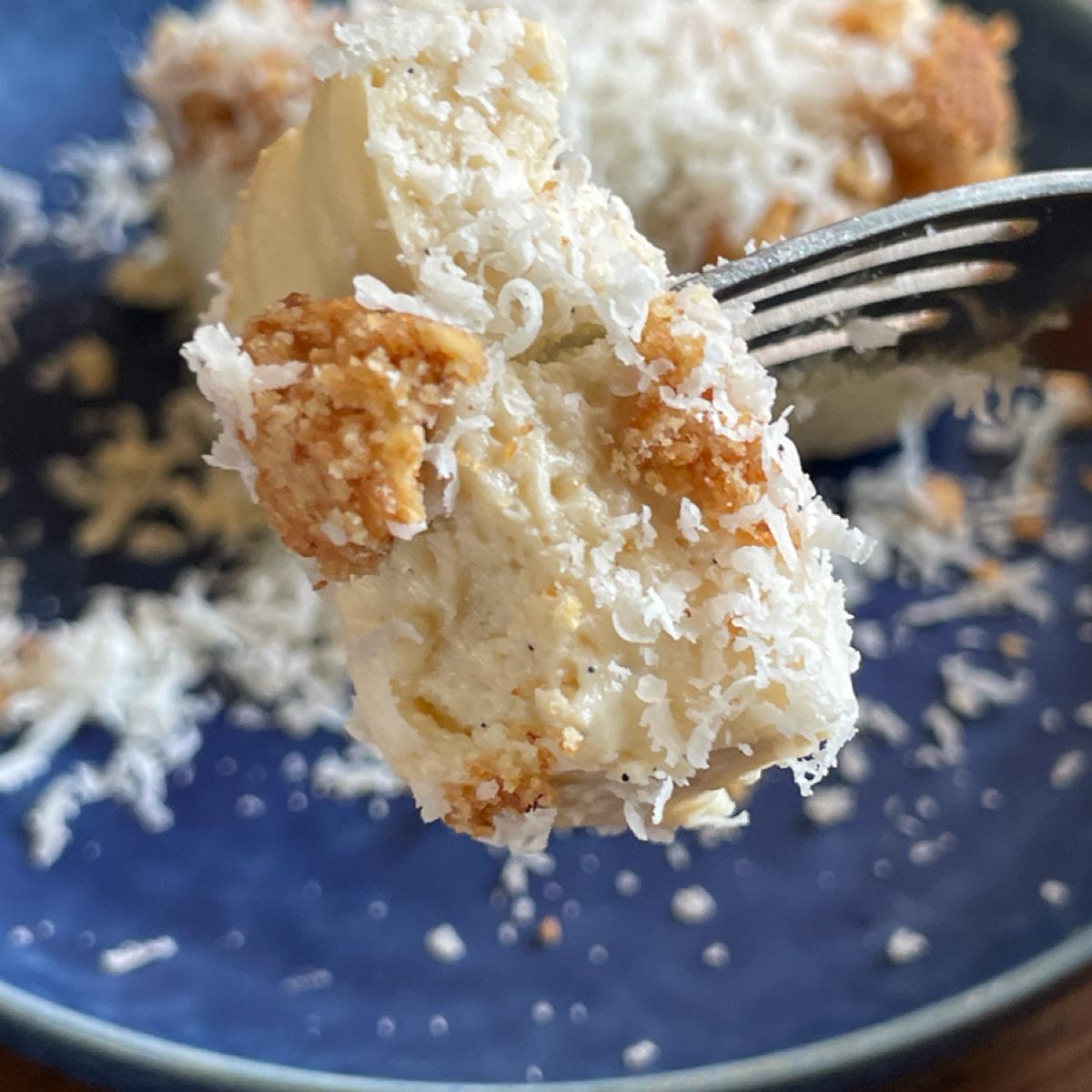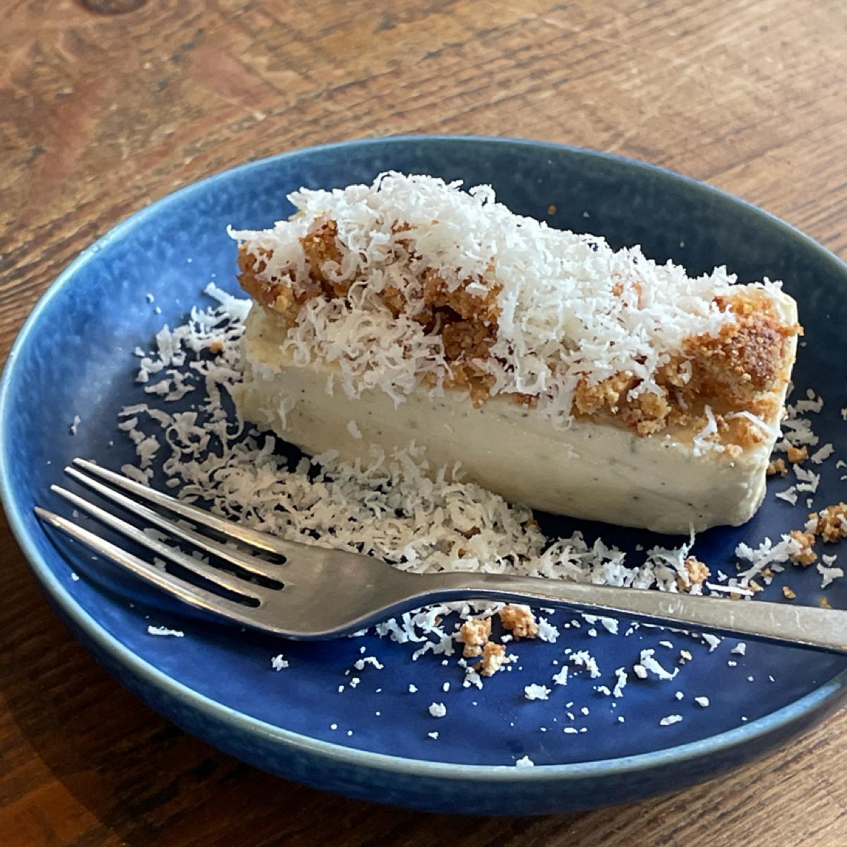 起司蛋糕,上面灑上起司粉末,濃郁的起司香味,本體吃起來不會到太甜超棒!口感有點像是乳酪,很推薦點這道甜點❤️