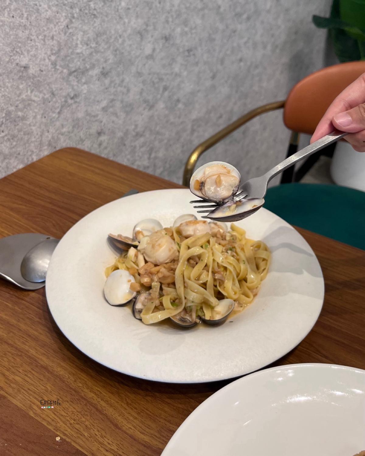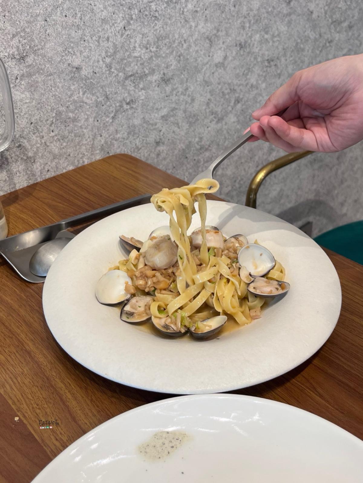 パスタは幅広のものを使用していて、ソースがしっかりしているので、味が薄くなる心配はありません~ 中にはたくさんのXOソースと小さな帆立が入っており、上には半熟の大きな帆立が2つ乗っています。アサリも大きくて、一つ一つがジューシーで甘みがあります!ネギがトッピングされています。