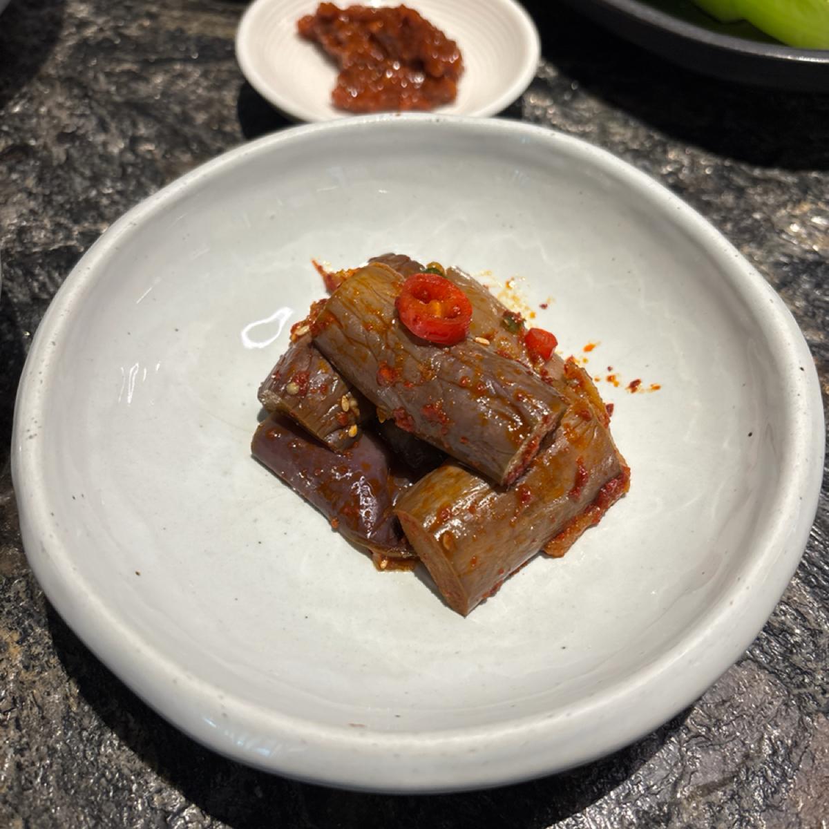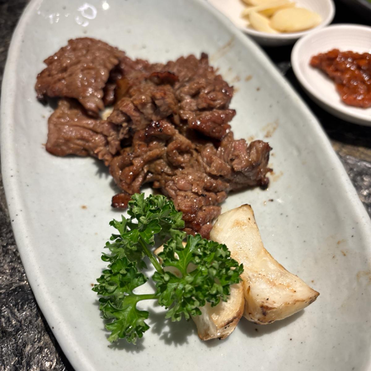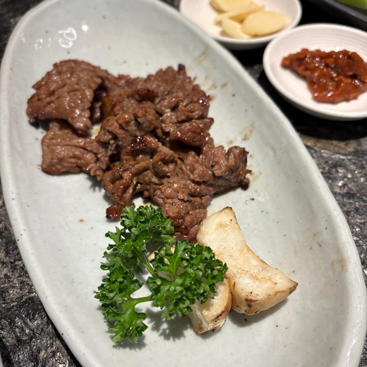 価格はやや高めの韓国料理ですが、実際にはボリュームがかなりありますので、多人数の集まりに適しています。全体的な食事体験は非常に良かったです。環境は快適で騒がしくなく、サイドディッシュの種類も豊富で味も良く、毎回食べ終わるとすぐに補充したくなります。一番印象に残ったのは、前菜のトマトで、使われているソースは多くのフルーツの風味が混ざっています。名物の牛カルビと辛炒め豚肉はどちらも濃い味付けですが、油っこくなく、新鮮でシャキッとしたレタスと一緒に食べることで飽きが来ません。非常におすすめです。