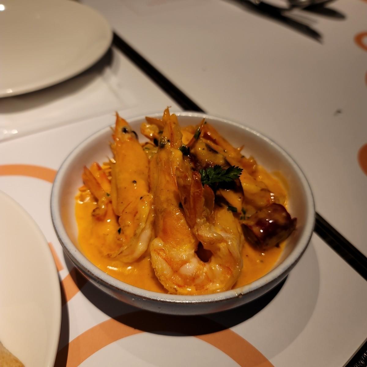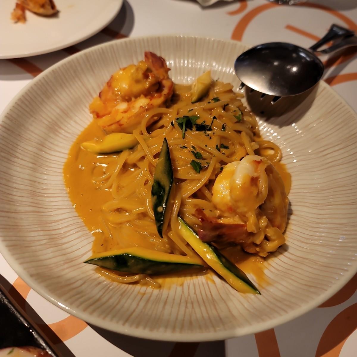 海老デュオのクリームパスタは、弾力のある麺に海老の油で揚げたような海老ソースがかかっており、噛むと海老の香りが香ばしく、満足感が溢れます。それ。