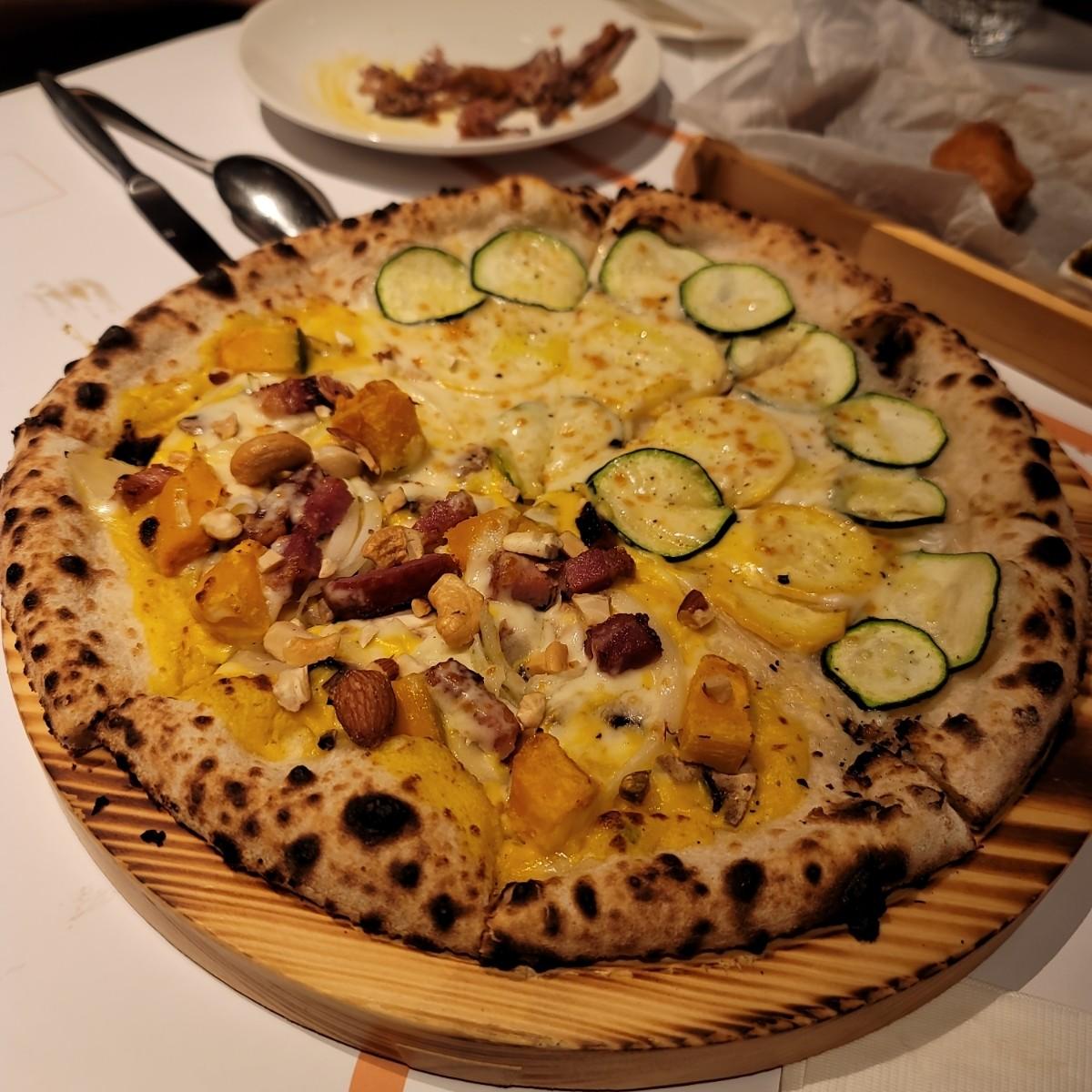マスカルポーネチーズメロンピザと栗かぼちゃチーズピザの2種類の9インチピザを2種類お選びいただけるダブルコンボです。ピザ生地はモチモチ、ズッキーニはシャキシャキ、濃厚なチーズとの相性が抜群でとても美味しいです。向こうにはかぼちゃと栗が乗っていますが、私はかぼちゃが苦手なのでコメントできませんが、上に添えられたハムがとても濃厚で風味が良くて美味しいです。