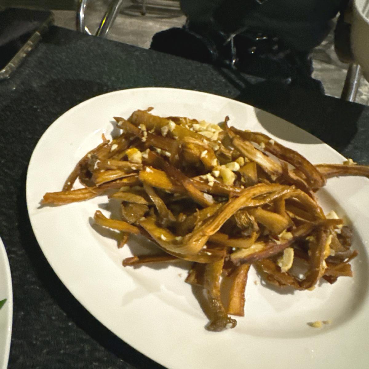 エリンギのフライは少しパサパサしていて、歯ごたえがあり、一口ずつ食べたくなります。