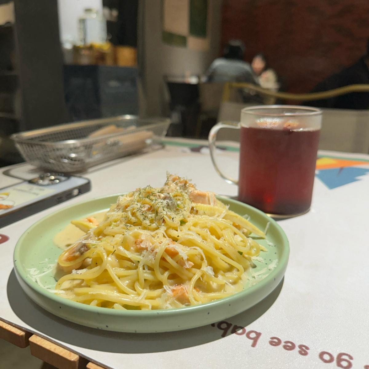 サーモンの身はとても新鮮で、一口一口がしっかりとしていて、麺部分も硬すぎず柔らかすぎずちょうど良い食感でとても美味しいです。クリームソースが全体的にサラサラしていて量もちょうど良いのが嬉しいですね!ペンチューブ麺への変更も可能です😍定食のパンはカリカリで香ばしく、濃厚でまろやかなクリーミーなキノコスープとの相性は抜群です!必見です! ! (ジェリーの妹のペン)