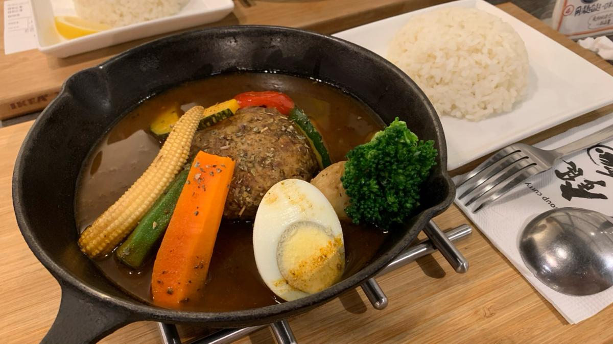 スープカレーは香辛料入りの肉汁に似ていて、ご飯の上にかけていただきます。ただ、この料理のご飯は米の選び方があまり良くなく、粒が明らかにサイズが異なり、食感も柔らかすぎました。