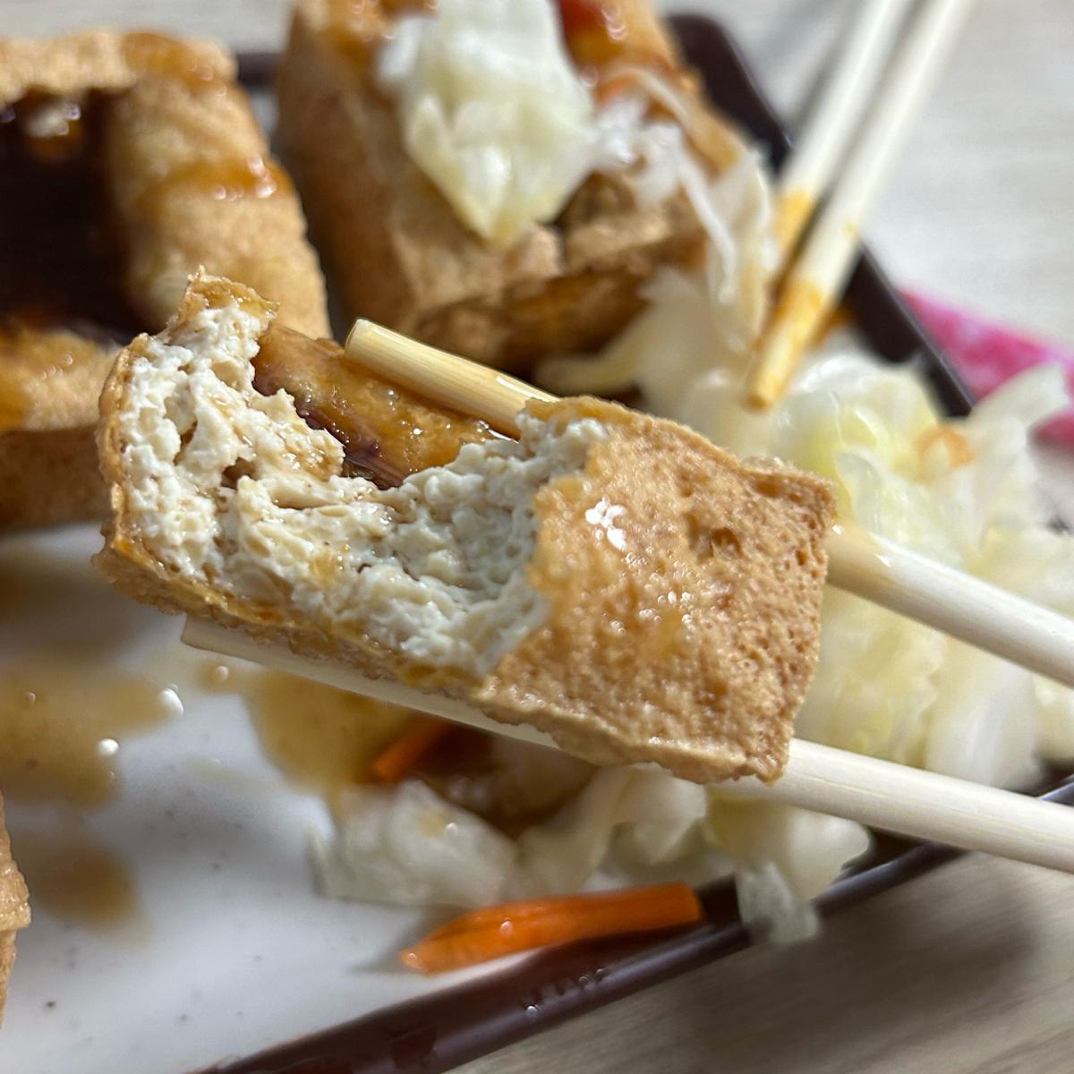 揚げ臭豆腐の外皮は本当にサクサクで、中は直接穴をあけてソースを入れるスタイルです。
