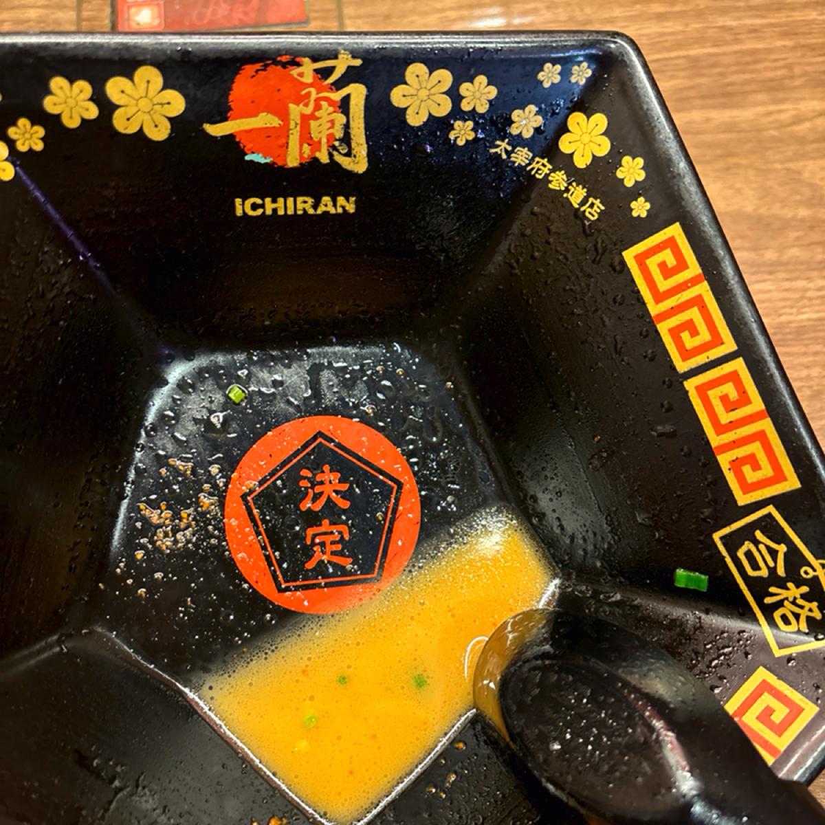 「五角」は日本語で「ごかく」と読み、「合格」と響きが似ています。この一蘭ではその語呂合わせを利用して五角形のボウルと箸を作りました!合格ラーメン(980円)を注文すると、ラーメンがテーブルに運ばれてくるときに「合格しました!」と言ってくれます😂
