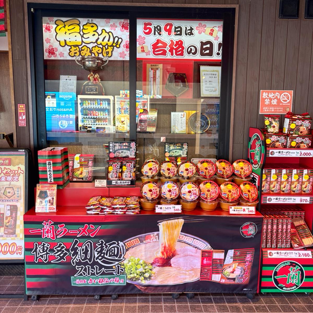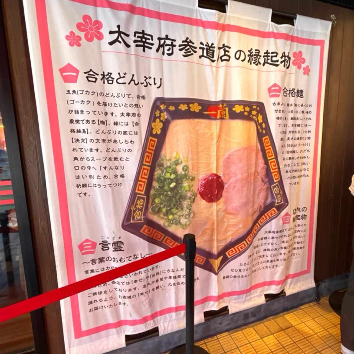 福岡の太宰府に到着すると、駅を出た瞬間に目立つ一蘭ラーメンと人々の行列が見えます。太宰府天満宮は学業成就を祈ることで有名で、周辺の店舗でもさまざまな「合格」に関連する吉祥商品を展開しています。