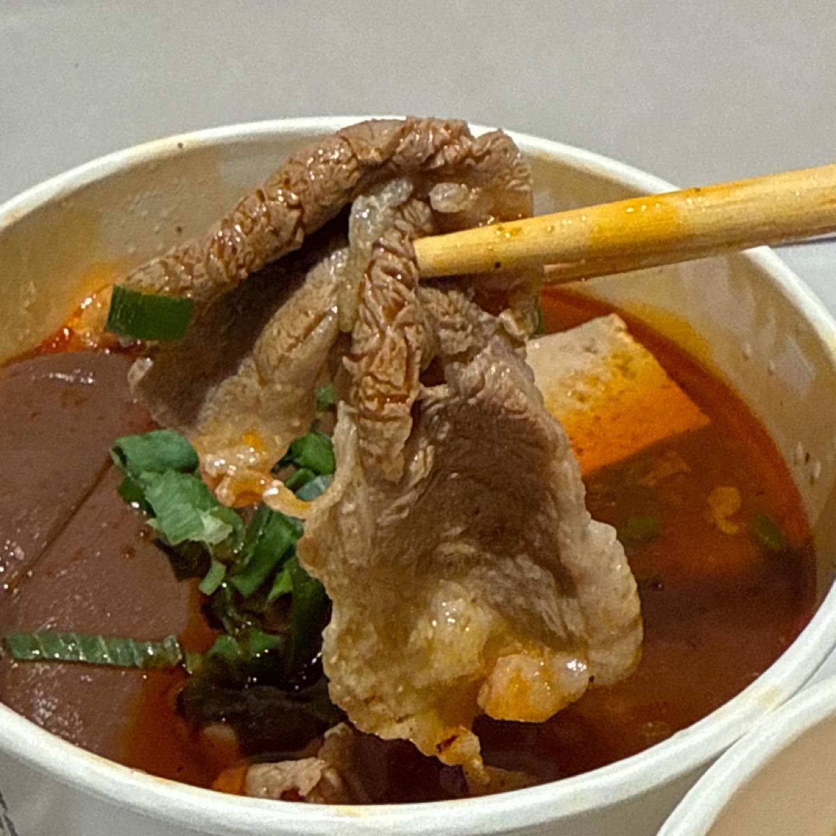 麻辣綜合には、軽量の牛肉スライス、滷鴨血(ゆでアヒルの血)、老豆腐(古い豆腐)、滷豆皮(ゆで豆皮)が含まれています。