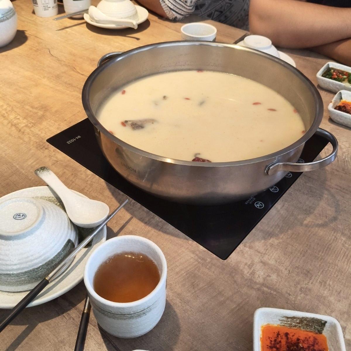 スープは胡椒の味が効いていて辛みがあり、体が温まります。鍋底の豚の胃や烏骨鶏はかなり多く、烏骨鶏は意外とやわらかく、燈を長くしないで約10分煮ると良いです。