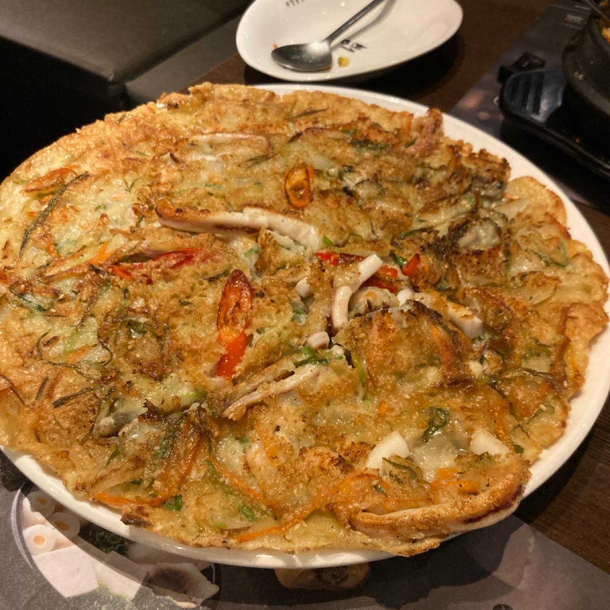 今回はキムチ豚肉鍋、松露チーズ卵巻、海鮮薄焼きを注文しました。二人で食べるにはボリュームがあり、食べきれなかった分は持ち帰りました。小菜(サイドディッシュ)は何度でも注文できるので、最初に小菜をたくさん食べ過ぎてしまいました。
