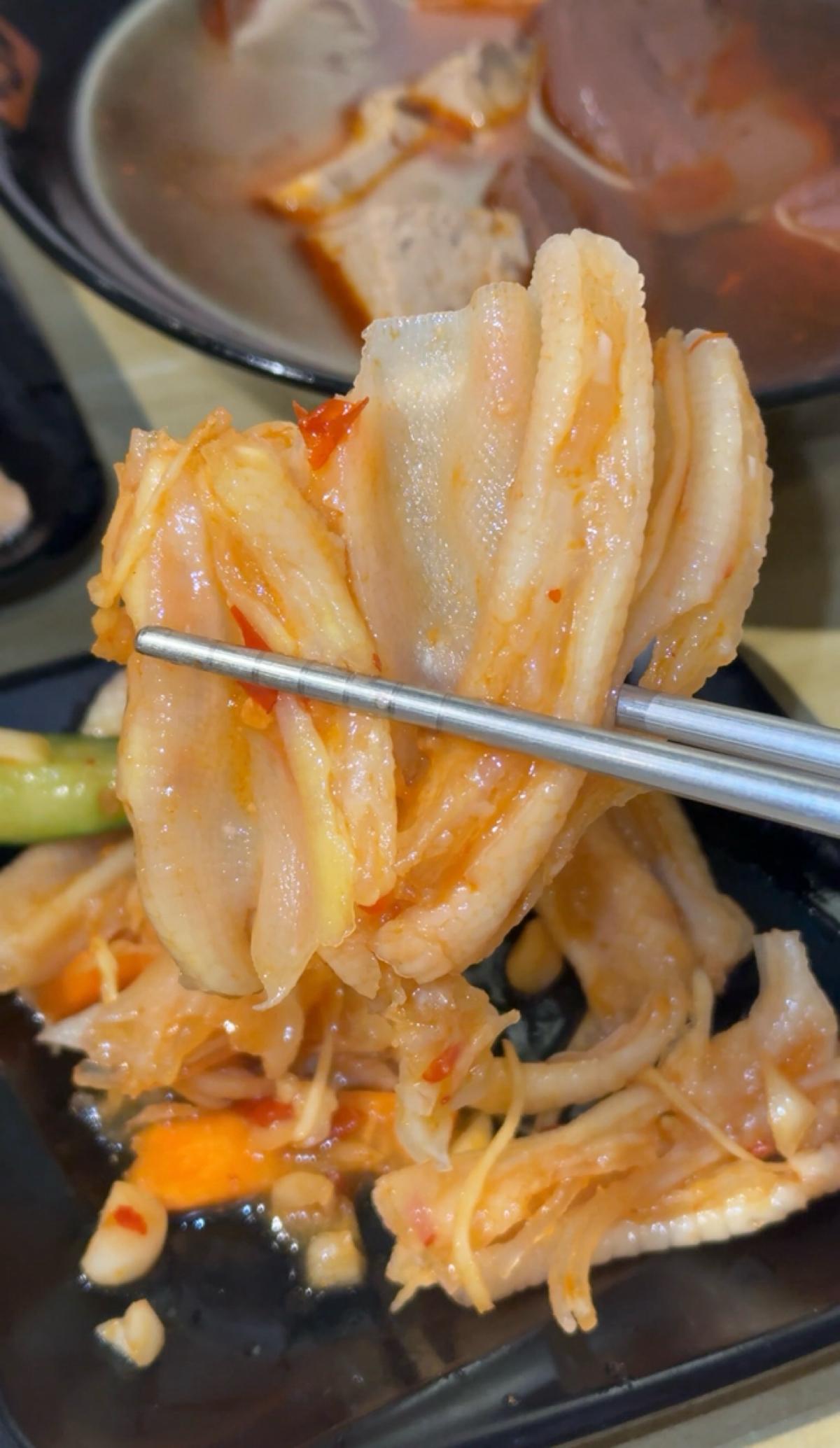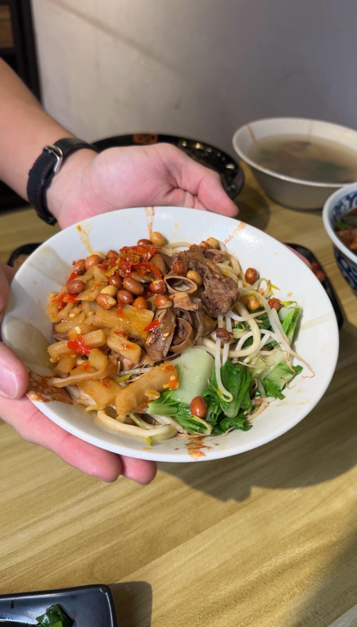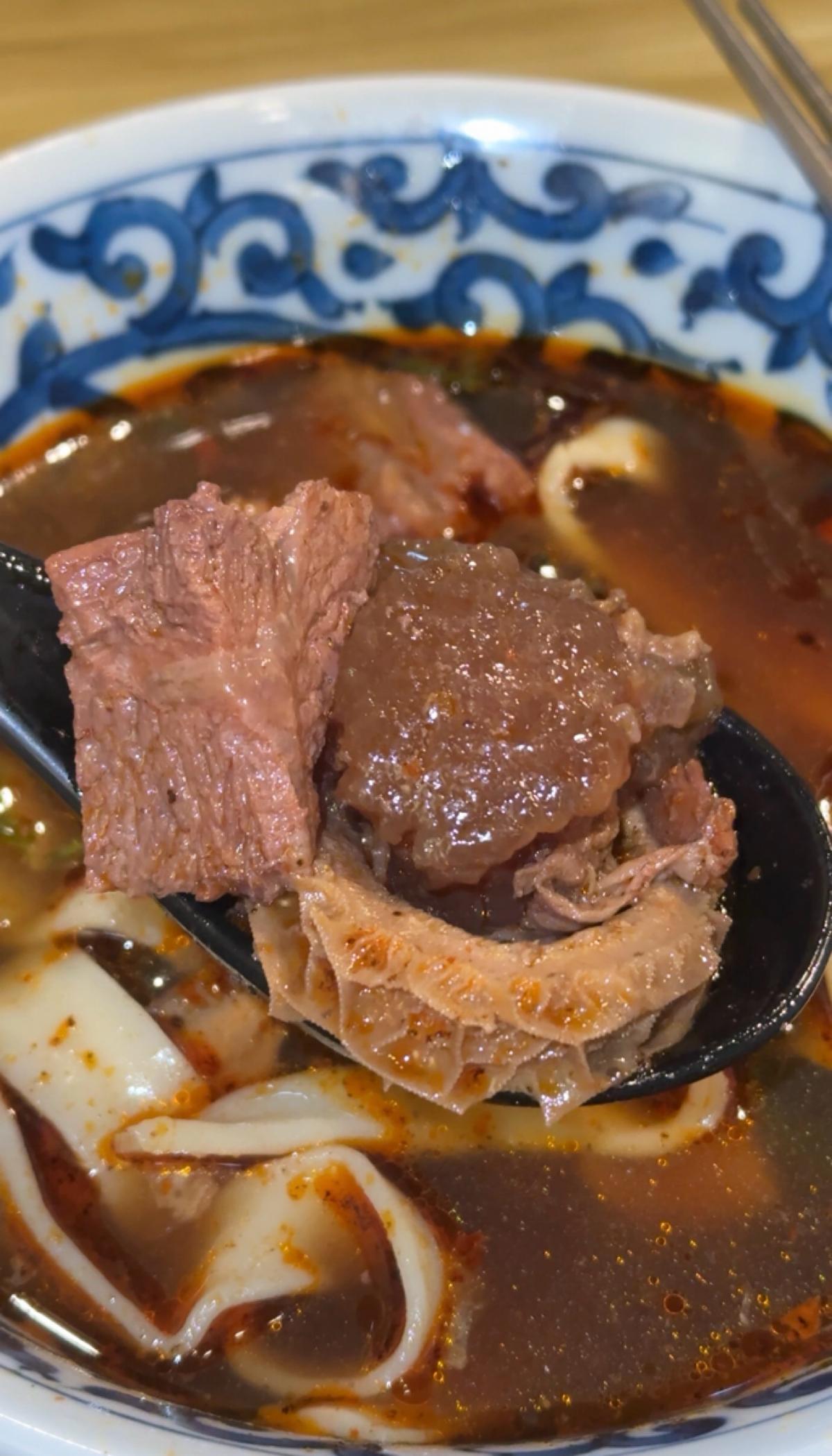 牛肉は筋が入っていますが超柔らかく、口に入れるとすぐに溶けます;牛筋はゼリーのように大きく、たっぷりのコラーゲンで非常に満足感があります;牛腸も味がしっかりとしみ込んでいて、噛むとちょうど良い食感です。スープは濃厚で香辛料の効いたタイプで、一口飲むと目が覚めます。