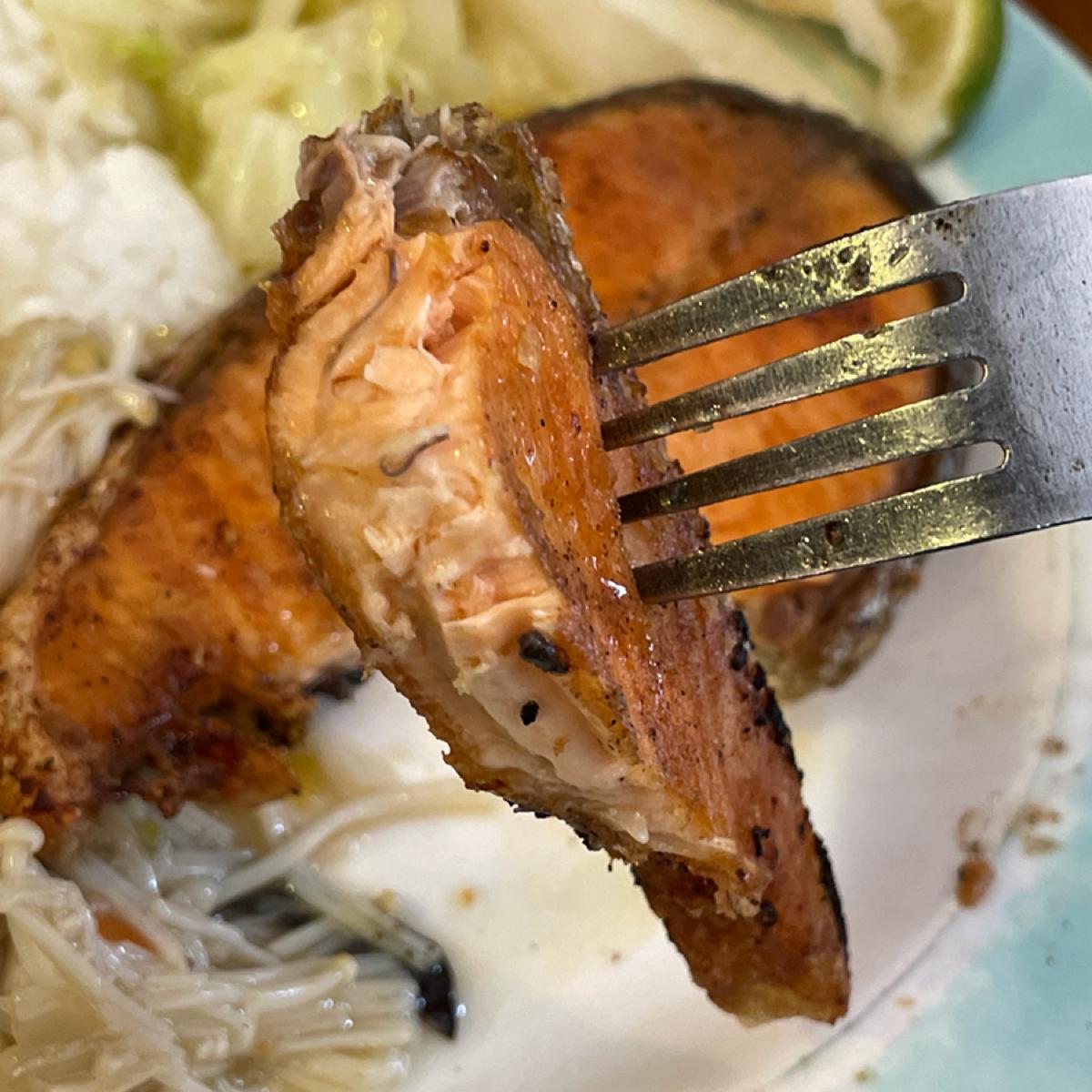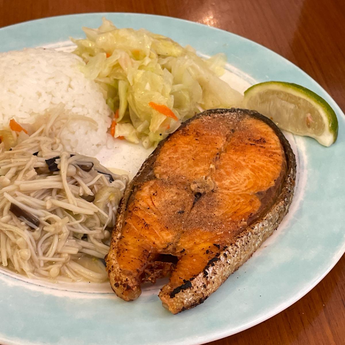 鮭魚は結構大きいですが、残念ながら焼きすぎて焦げてしまいました。表面はカリカリですが、身の部分は非常に乾燥してしまっていて、肉乾を食べているのかなと思うほどです!レモンが添えられているのは評価が高いです!
