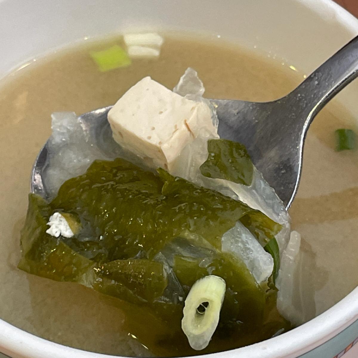 🔹スープ:味噌汁には具が結構多い(豆腐、昆布、玉ねぎなど)