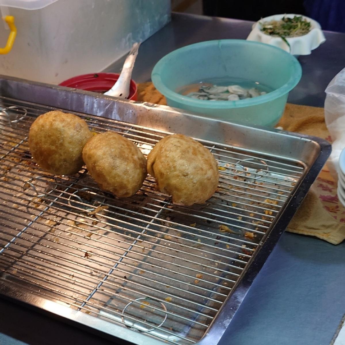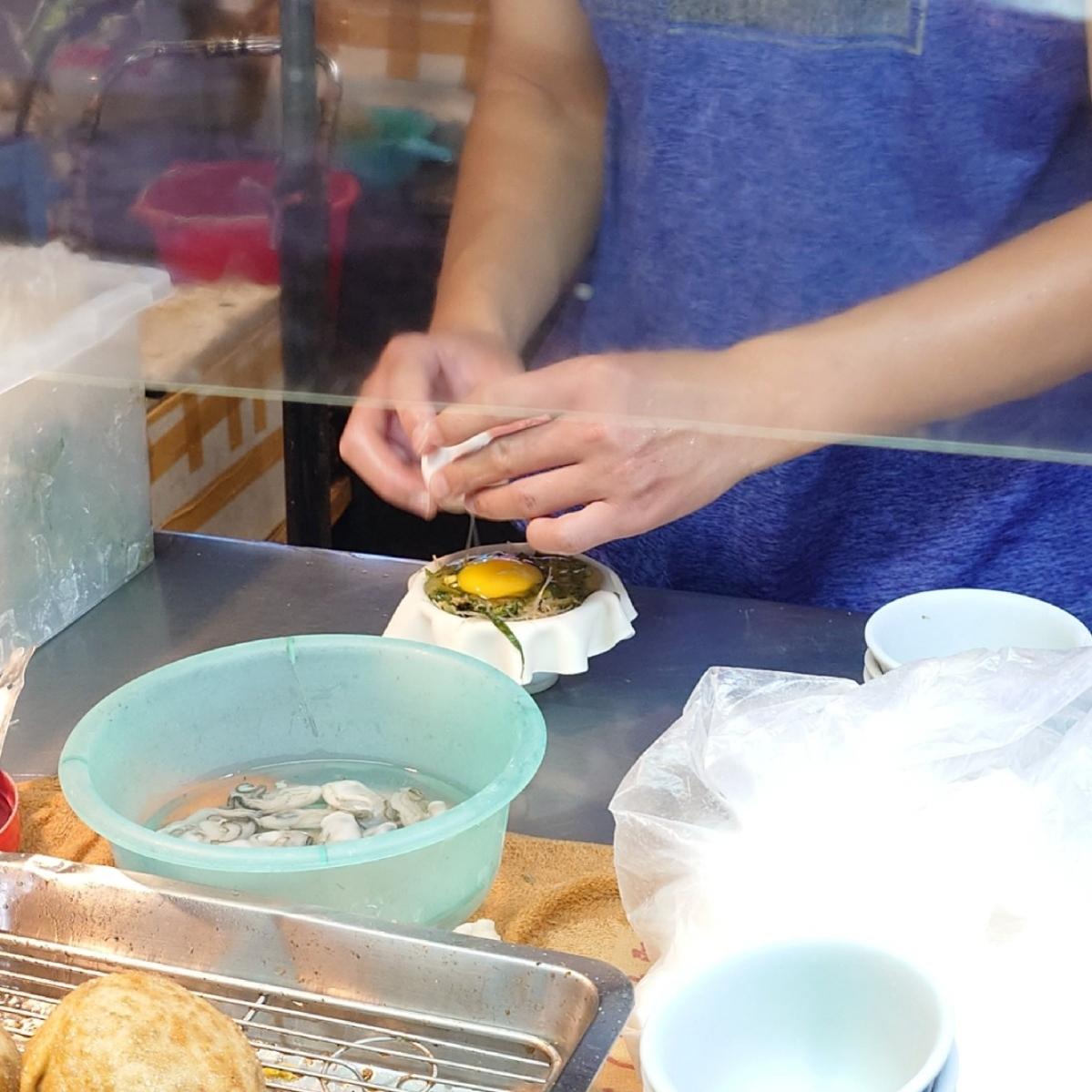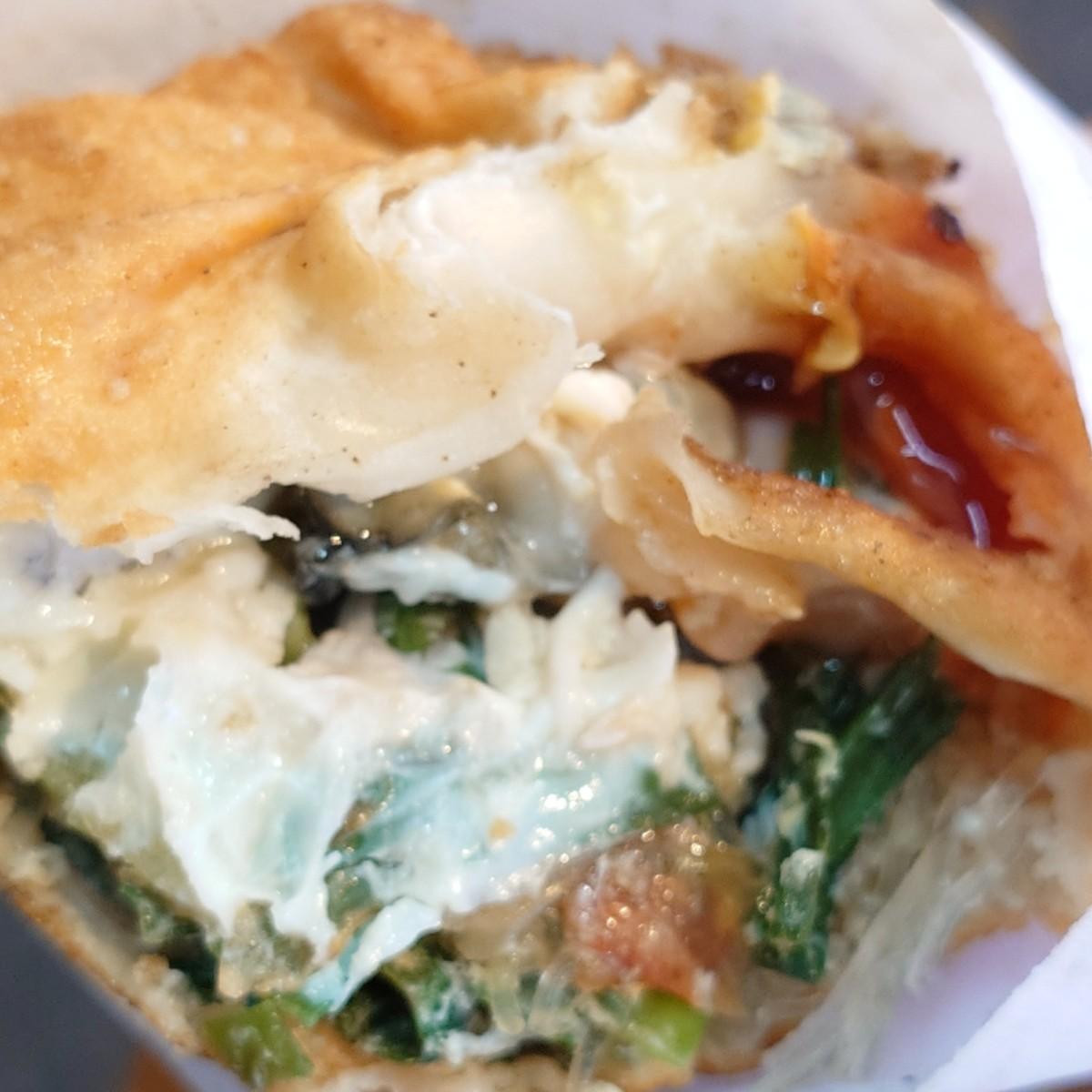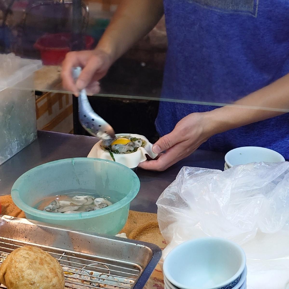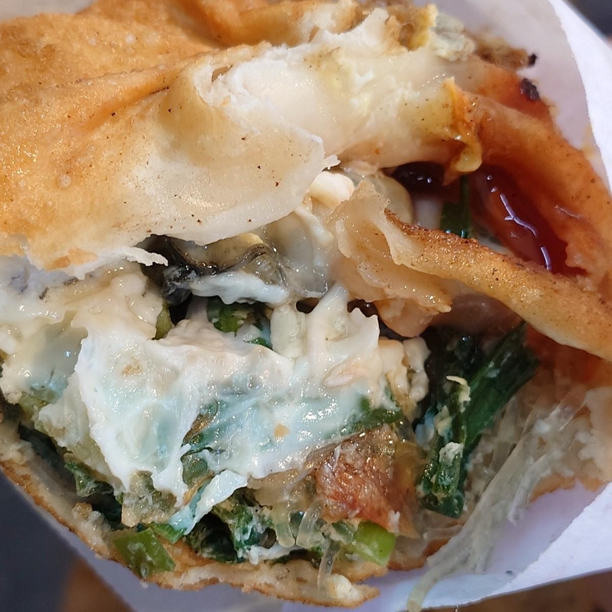 蚵蛋包は、皿に薄い生地をしいて、層ごとに具を乗せ、新鮮なネギの甘さや、新鮮に打った卵が一緒に合わさるのが素晴らしい。さらに、下の層の具材もあります。