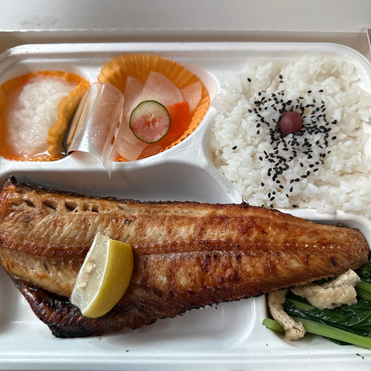 豚肉は日本の伝統的な塩麴でマリネされた後、炭火で焼かれ、香ばしい五花肉は柔らかくてジューシーです。外皮は少し焦げた香りがあり、中の肉汁がしっかりと保たれていて、ひと口ごとに塩麴の深い風味が感じられます。レモンのスライスが添えられていて、絞ることで脂を中和し、全体のバランスが向上します。弁当には白ご飯と3種類の日式おかずも付いており、組み合わせもバランスが取れていて変化があります。