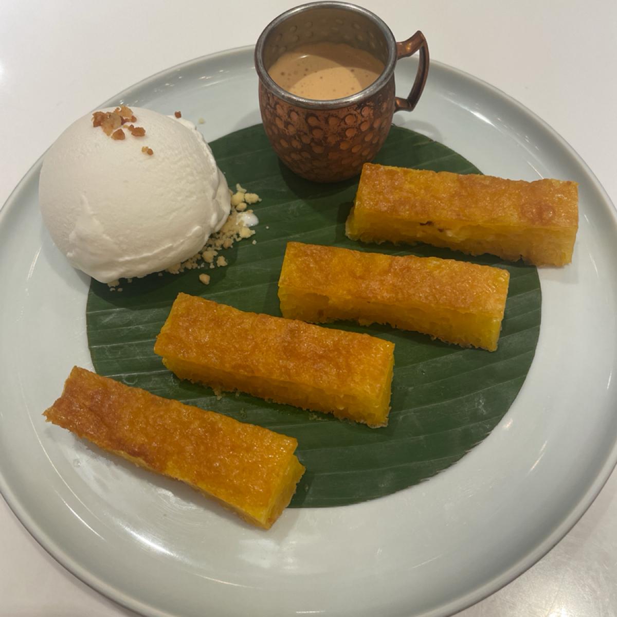 黄金のケーキは澎湖黒糖ケーキのような味で、さらにタイミルクソースがかかっていて、付属のココナッツミルクアイスクリームが添えられていて、とても美味しいです。料理だけどちょっと高い、cp値は高くない