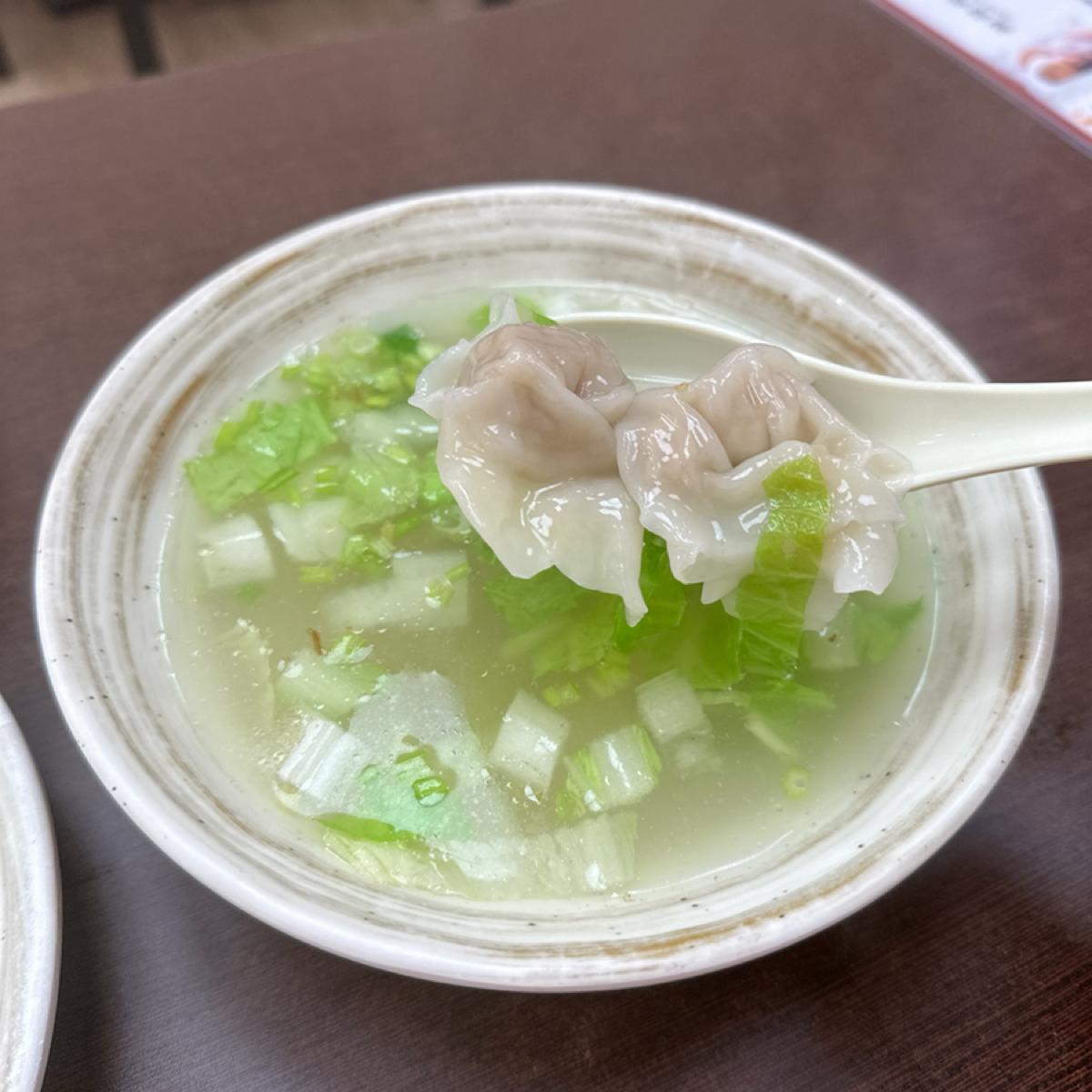 ✅ワンタンスープ:一杯のスープにワンタンが5個入っています。ワンタンの大きさはそれほど大きくありませんが、中の肉は塩辛くなく、味付けもちょうど良いです。スープにはエシャロットが加えられ、コクがありながらも脂っこくない味わいになっています。