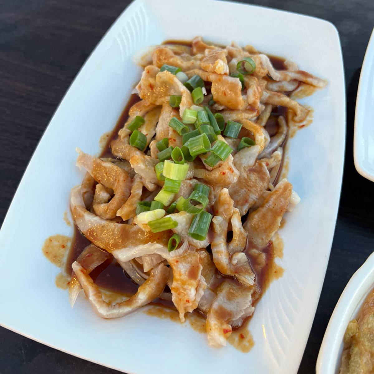 最後に、葱香炒めの塩豚肉ですが、この料理は少し塩味が強いですが、その分ご飯が進みます。豚肉は適度にスライスされ、炒め具合も完璧で、葱の香りと組み合わさって、ちょっと味が濃いですが、ますます食べたくなる美味しさです。